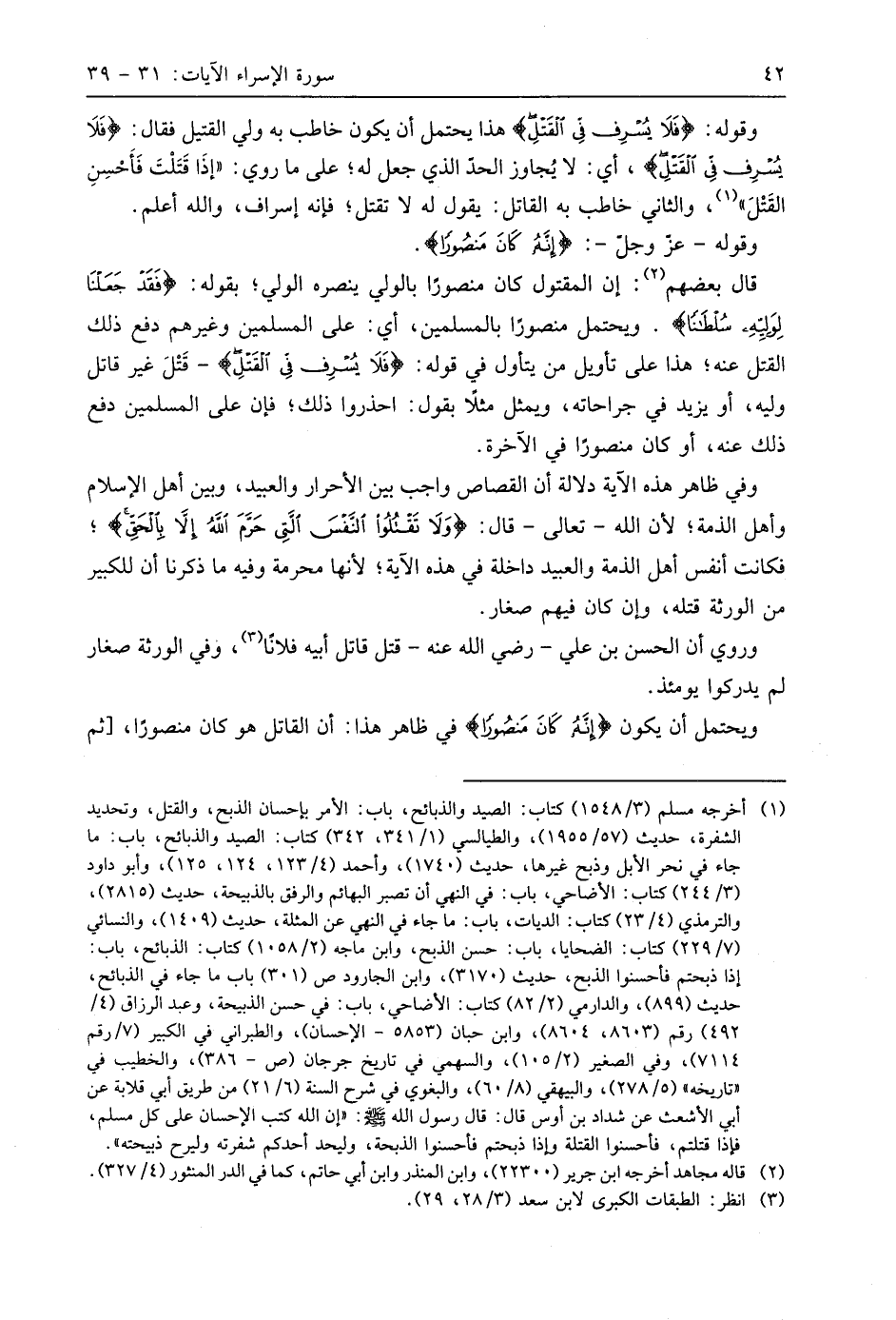 وقوله: (فَلَا يُسْرِفْ فِي الْقَتْلِ) هذا يحتمل أن يكون خاطب به ولي القتيل فقال: (فَلَا يُسْرِفْ فِي الْقَتْلِ)، أي: لا يُجاوز الحد الذي جعل له؛ على ما روي: " إذَا قَتَلْتَ فَأَحْسِنِ القَتْلَ "، والثاني خاطب به القاتل: يقول له لا تقتل؛ فإنه إسراف، واللَّه أعلم.