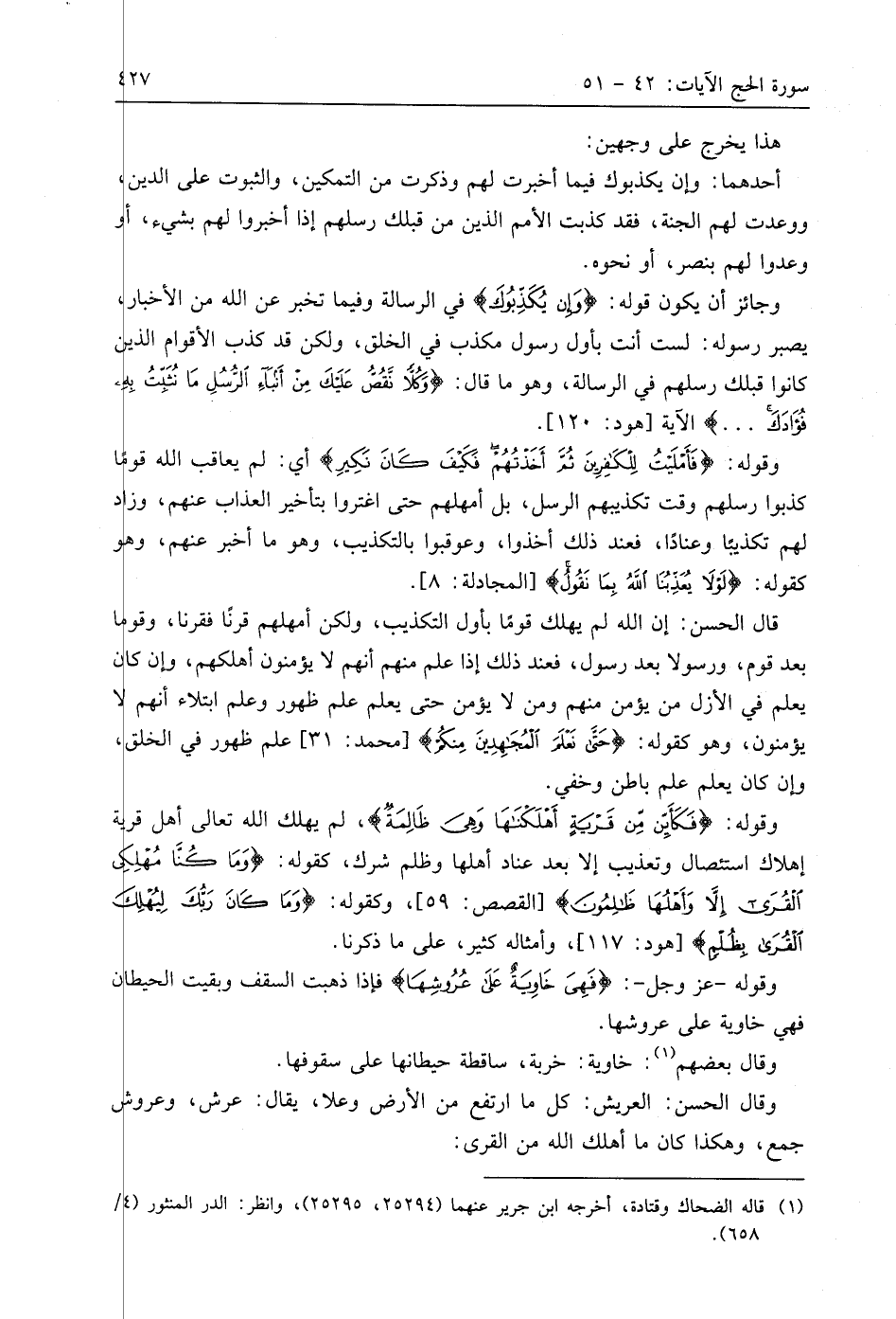 وقوله: (فَكَأَيِّنْ مِنْ قَرْيَةٍ أَهْلَكْنَاهَا وَهِيَ ظَالِمَةٌ فَهِيَ خَاوِيَةٌ عَلَى عُرُوشِهَا وَبِئْرٍ مُعَطَّلَةٍ وَقَصْرٍ مَشِيدٍ (45) لم يهلك اللَّه تعالى أهل قرية إهلاك استئصال وتعذيب إلا بعد عناد أهلها وظلم شرك، كقوله: (وَمَا كُنَّا مُهْلِكِي الْقُرَى إِلَّا وَأَهْلُهَا ظَالِمُونَ)، وكقوله: (وَمَا كَانَ رَبُّكَ لِيُهْلِكَ الْقُرَى بِظُلْمٍ)، وأمثاله كثير، على ما ذكرنا.