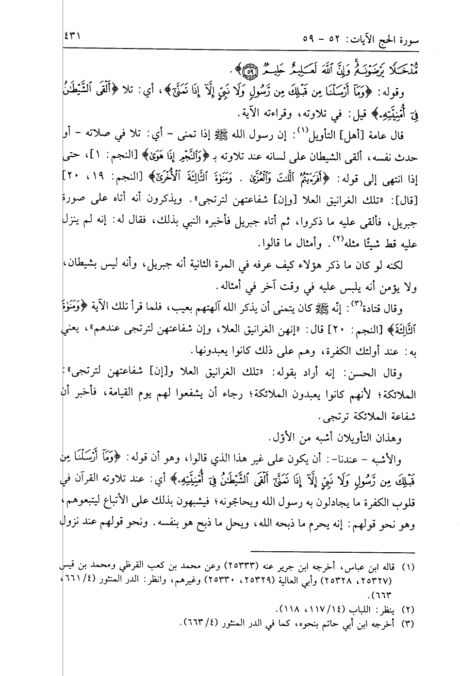 قال عامة أهل التأويل: إن رسول اللَّه - صَلَّى اللَّهُ عَلَيهِ وَسَلَّمَ - إذا تمنى - أي: تلا في صلاته - أو حدث نفسه، ألقى الشيطان على لسانه عند تلاوته بـ (وَالنَّجْمِ إِذَا هَوَى) حتى إذا انتهى إلى قوله: (أَفَرَأَيْتُمُ اللَّاتَ وَالْعُزَّى (19) وَمَنَاةَ الثَّالِثَةَ الْأُخْرَى). قال: " تلك الغرانيق العلا وإن شفاعتهن لترتجى ". ويذكرون أنه أتاه على صور جبريل، فألقى عليه ما ذكروا، ثم أتاه جبريل فأخبره النبي بذلك، فقال له: إنه لم ينزل عليه قط شيئًا مثله. وأمثال ما قالوا.