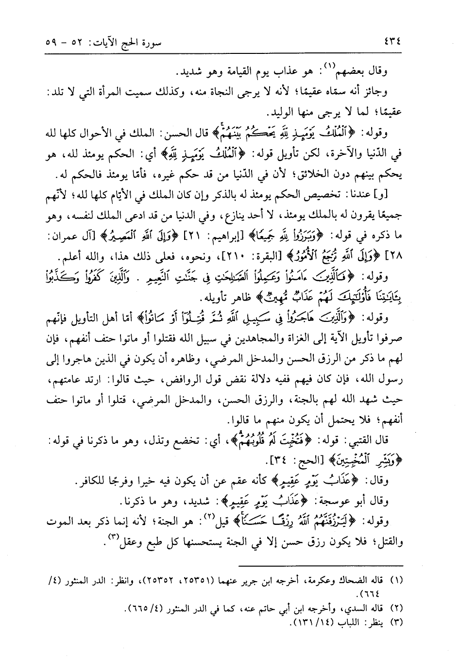وقوله: (الْمُلْكُ يَوْمَئِذٍ لِلَّهِ يَحْكُمُ بَيْنَهُمْ فَالَّذِينَ آمَنُوا وَعَمِلُوا الصَّالِحَاتِ فِي جَنَّاتِ النَّعِيمِ (56) قال الحسن: الملك في الأحوال كلها لله في الدُّنيَا والآخرة، لكن تأويل قوله: (الْمُلْكُ يَوْمَئِذٍ لِلَّهِ) أي: الحكم يومئذ لله، هو يحكم بينهم دون الخلائق؛ لأن في الدُّنيَا من قد حكم غيره، فأما يومئذ فالحكم له.