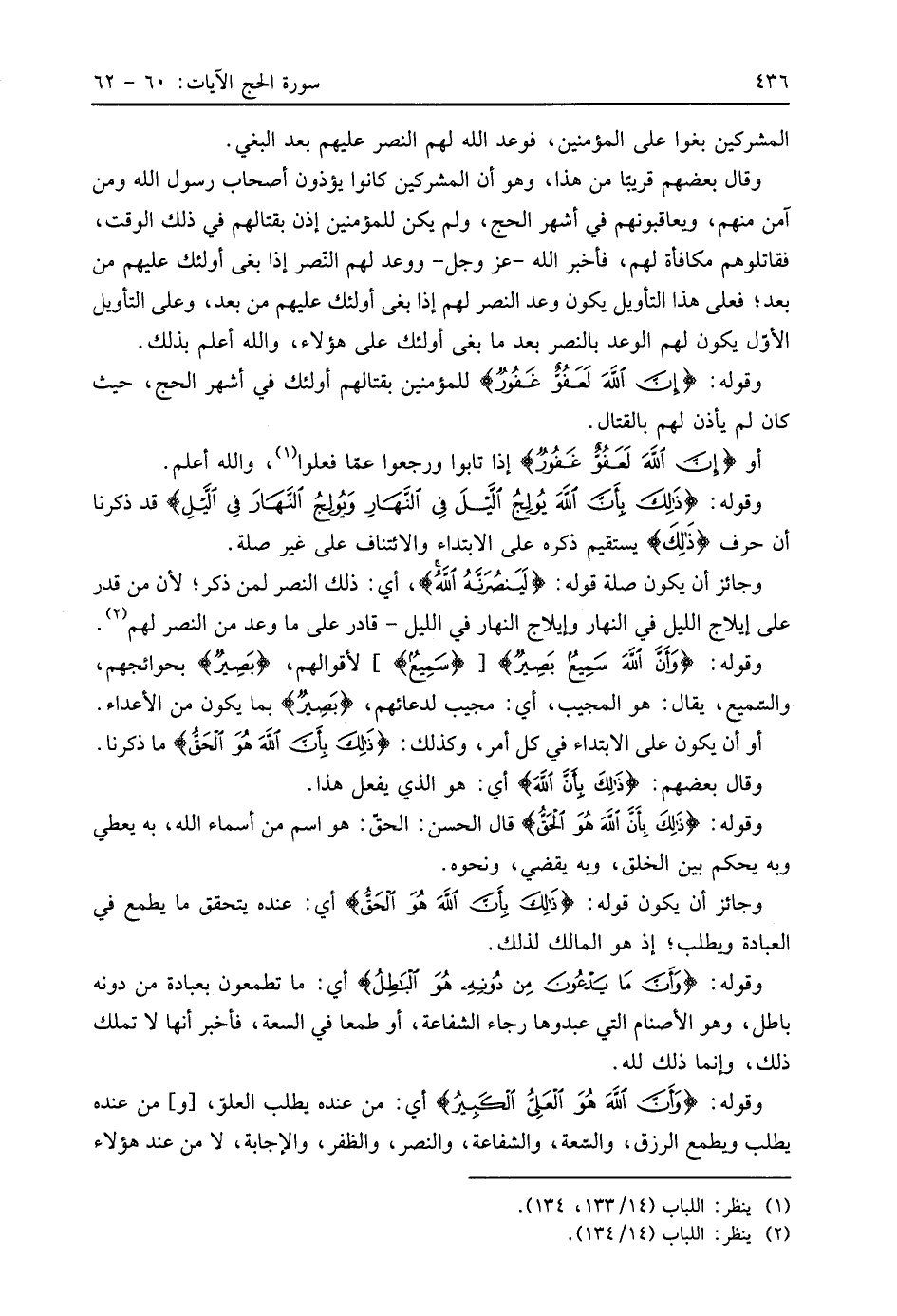 وجائز أن يكون صلة قوله: (لَيَنْصُرَنَّهُ اللَّهُ)، أي: ذلك النصر لمن ذكر؛ لأن من قدر على إيلاج الليل في النهار وإيلاج النهار في الليل - قادر على ما وعد من النصر لهم.