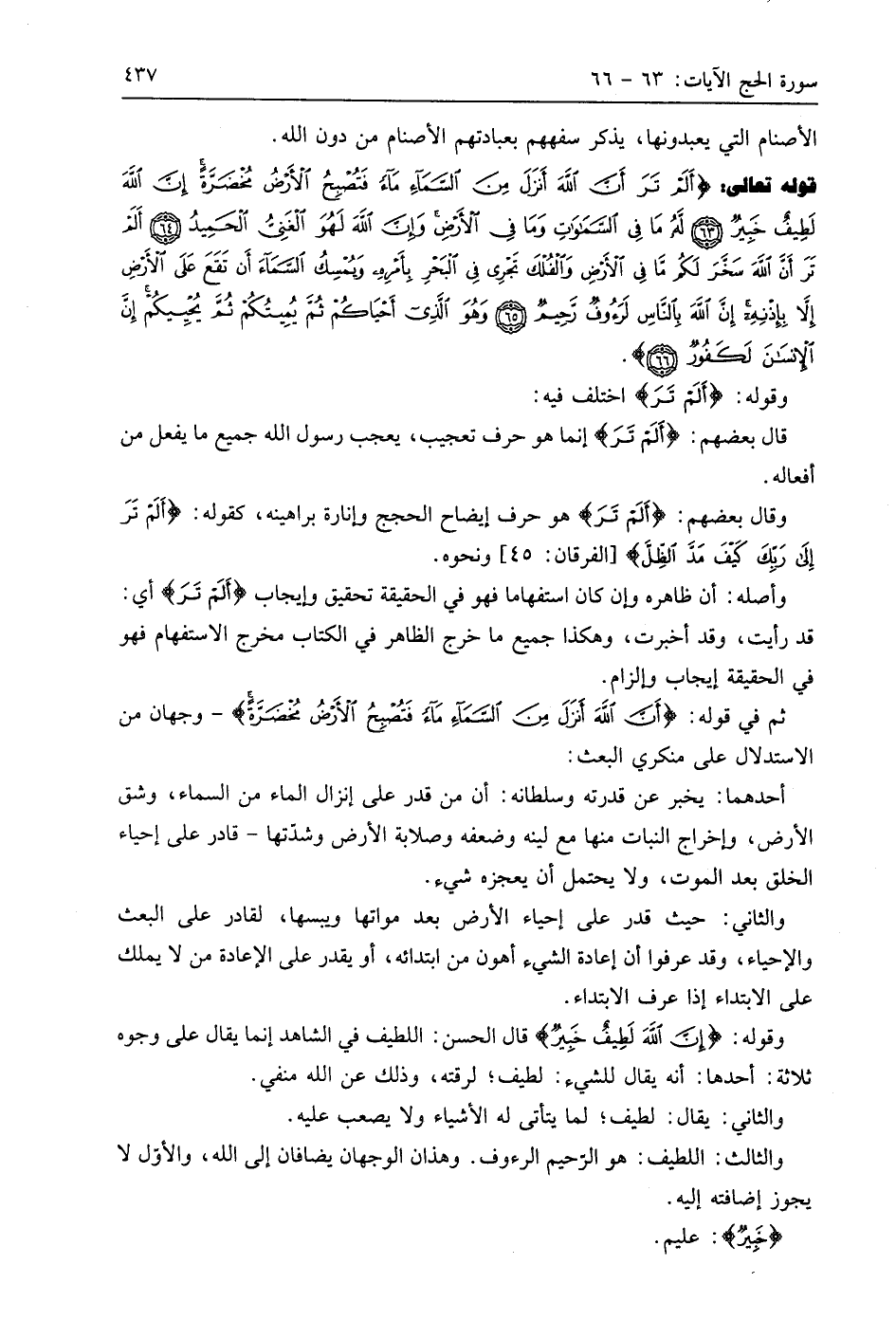 قوله تعالى: (أَلَمْ تَرَ أَنَّ اللَّهَ أَنْزَلَ مِنَ السَّمَاءِ مَاءً فَتُصْبِحُ الْأَرْضُ مُخْضَرَّةً إِنَّ اللَّهَ لَطِيفٌ خَبِيرٌ (63) لَهُ مَا فِي السَّمَاوَاتِ وَمَا فِي الْأَرْضِ وَإِنَّ اللَّهَ لَهُوَ الْغَنِيُّ الْحَمِيدُ (64) أَلَمْ تَرَ أَنَّ اللَّهَ سَخَّرَ لَكُمْ مَا فِي الْأَرْضِ وَالْفُلْكَ تَجْرِي فِي الْبَحْرِ بِأَمْرِهِ وَيُمْسِكُ السَّمَاءَ أَنْ تَقَعَ عَلَى الْأَرْضِ إِلَّا بِإِذْنِهِ إِنَّ اللَّهَ بِالنَّاسِ لَرَءُوفٌ رَحِيمٌ (65) وَهُوَ الَّذِي أَحْيَاكُمْ ثُمَّ يُمِيتُكُمْ ثُمَّ يُحْيِيكُمْ إِنَّ الْإِنْسَانَ لَكَفُورٌ (66)