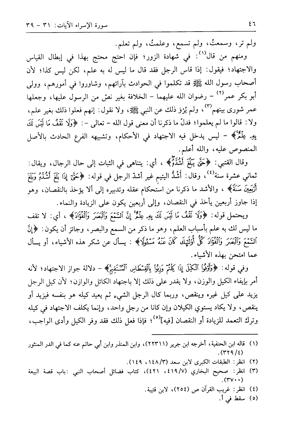 ومنهم من قال: في شهادة الزور؛ فإن احتج محتج بهذا في إبطال القياس والاجتهاد؛ فيقول: إذا قاس الرجل فقد قال ما ليس له به علم، لكن ليس كذا؛ لأن أصحاب رسول اللَّه - صَلَّى اللَّهُ عَلَيهِ وَسَلَّمَ - قد تكلموا في الحوادث بآرائهم، وشاوروا في أمورهم، وولى أبو بكر عمر - رضوان اللَّه عليهما - الخلافة بغير نصٍّ من الرسول عليها، وجعلها عمر شورى بينهم، ولم يُروَ ذلك عن النبي - صَلَّى اللَّهُ عَلَيهِ وَسَلَّمَ -، ولا نقول: إنهم فعلوا ذلك بغير علم، ولا: قالوا ما لم يعلموا؛ فدل ما ذكرنا أن معنى قول اللَّه - تعالى -: (وَلَا تَقْفُ مَا لَيْسَ لَكَ بِهِ عِلْمٌ) - ليس يدخل فيه الاجتهاد في الأحكام، وتشبيهه الفرع الحادث بالأصل المنصوص عليه، واللَّه أعلم.