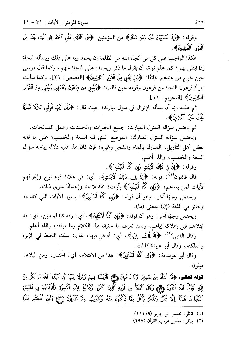 هكذا الواجب على كل من أنجاه اللَّه من الظلمة أن يحمد ربه على ذلك ويسأله النجاة إذا ابتلي بهم؛ كما علم نوحًا أن يقول ما ذكر ويحمده على النجاة منهم، وكما قال موسى حين خرج من عندهم خائفا: (رَبِّ نَجِّنِي مِنَ الْقَوْمِ الظَّالِمِينَ)، وكما سألت امرأة فرعون النجاة من فرعون وقومه حين قالت: (وَنَجِّنِي مِنْ فِرْعَوْنَ وَعَمَلِهِ وَنَجِّنِي مِنَ الْقَوْمِ الظَّالِمِينَ).