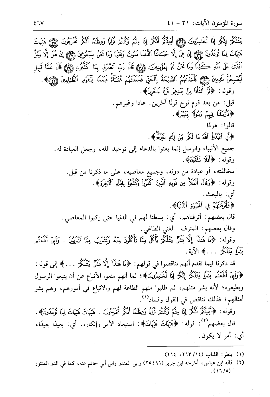 مِثْلَكُمْ إِنَّكُمْ إِذًا لَخَاسِرُونَ (34) أَيَعِدُكُمْ أَنَّكُمْ إِذَا مِتُّمْ وَكُنْتُمْ تُرَابًا وَعِظَامًا أَنَّكُمْ مُخْرَجُونَ (35) هَيْهَاتَ هَيْهَاتَ لِمَا تُوعَدُونَ (36) إِنْ هِيَ إِلَّا حَيَاتُنَا الدُّنْيَا نَمُوتُ وَنَحْيَا وَمَا نَحْنُ بِمَبْعُوثِينَ (37) إِنْ هُوَ إِلَّا رَجُلٌ افْتَرَى عَلَى اللَّهِ كَذِبًا وَمَا نَحْنُ لَهُ بِمُؤْمِنِينَ (38) قَالَ رَبِّ انْصُرْنِي بِمَا كَذَّبُونِ (39) قَالَ عَمَّا قَلِيلٍ لَيُصْبِحُنَّ نَادِمِينَ (40) فَأَخَذَتْهُمُ الصَّيْحَةُ بِالْحَقِّ فَجَعَلْنَاهُمْ غُثَاءً فَبُعْدًا لِلْقَوْمِ الظَّالِمِينَ (41)