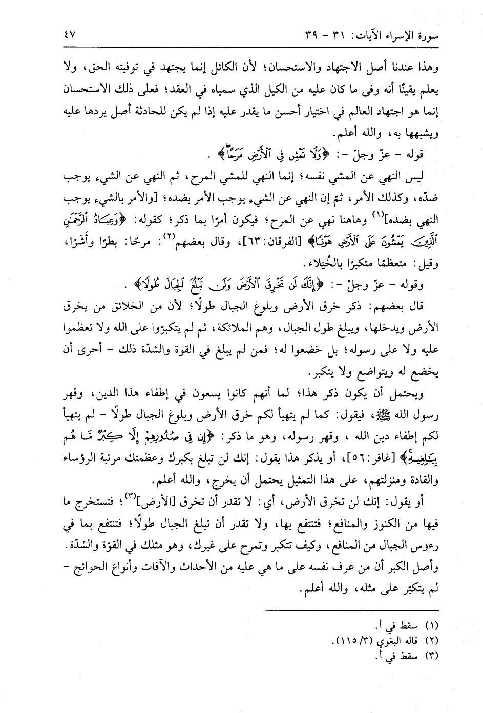 قوله - عَزَّ وَجَلَّ -: (وَلَا تَمْشِ فِي الْأَرْضِ مَرَحًا إِنَّكَ لَنْ تَخْرِقَ الْأَرْضَ وَلَنْ تَبْلُغَ الْجِبَالَ طُولًا (37)