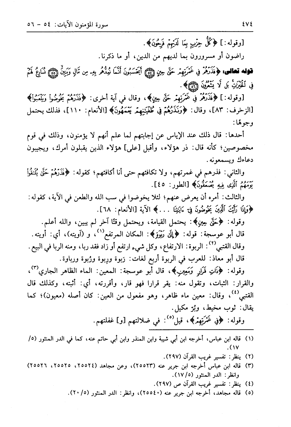 وقوله: (فَذَرْهُمْ فِي غَمْرَتِهِمْ حَتَّى حِينٍ)، وقال في آية أخرى: (فَذَرْهُمْ يَخُوضُوا وَيَلْعَبُوا)، وقال: (وَنَذَرُهُمْ فِي طُغْيَانِهِمْ يَعْمَهُونَ)، فذلك يحتمل وجوهًا: