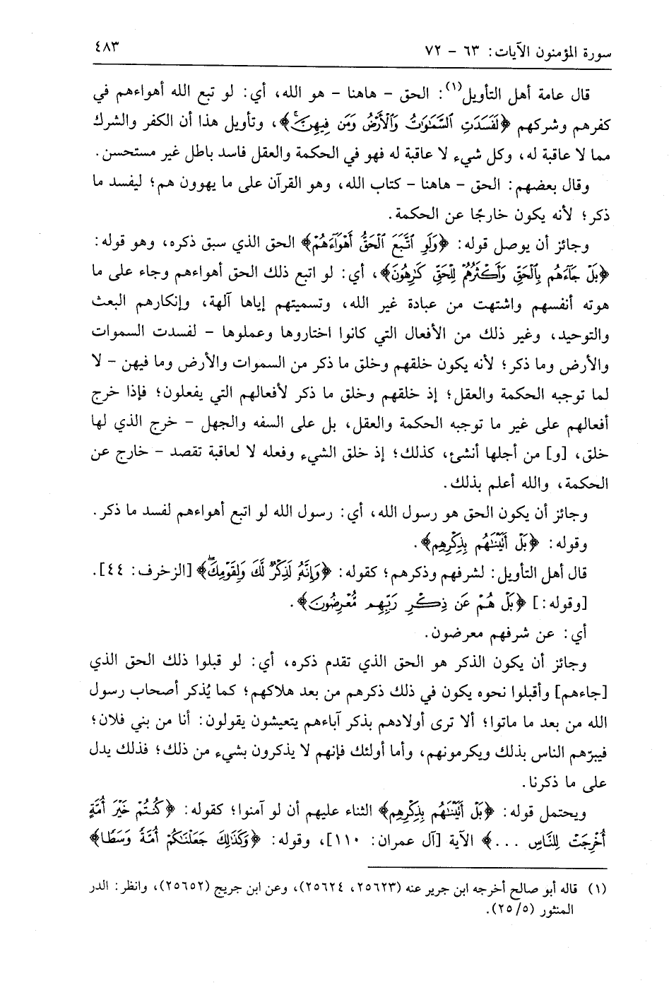 قال عامة أهل التأويل: الحق - هاهنا - هو اللَّه، أي: لو تبع اللَّه أهواءهم في كفرهم وشركهم (لَفَسَدَتِ السَّمَاوَاتُ وَالْأَرْضُ وَمَنْ فِيهِنَّ)، وتأويل هذا أن الكفر والشرك مما لا عاقبة له، وكل شيء لا عاقبة له فهو في الحكمة والعقل فاسد باطل غير مستحسن.
