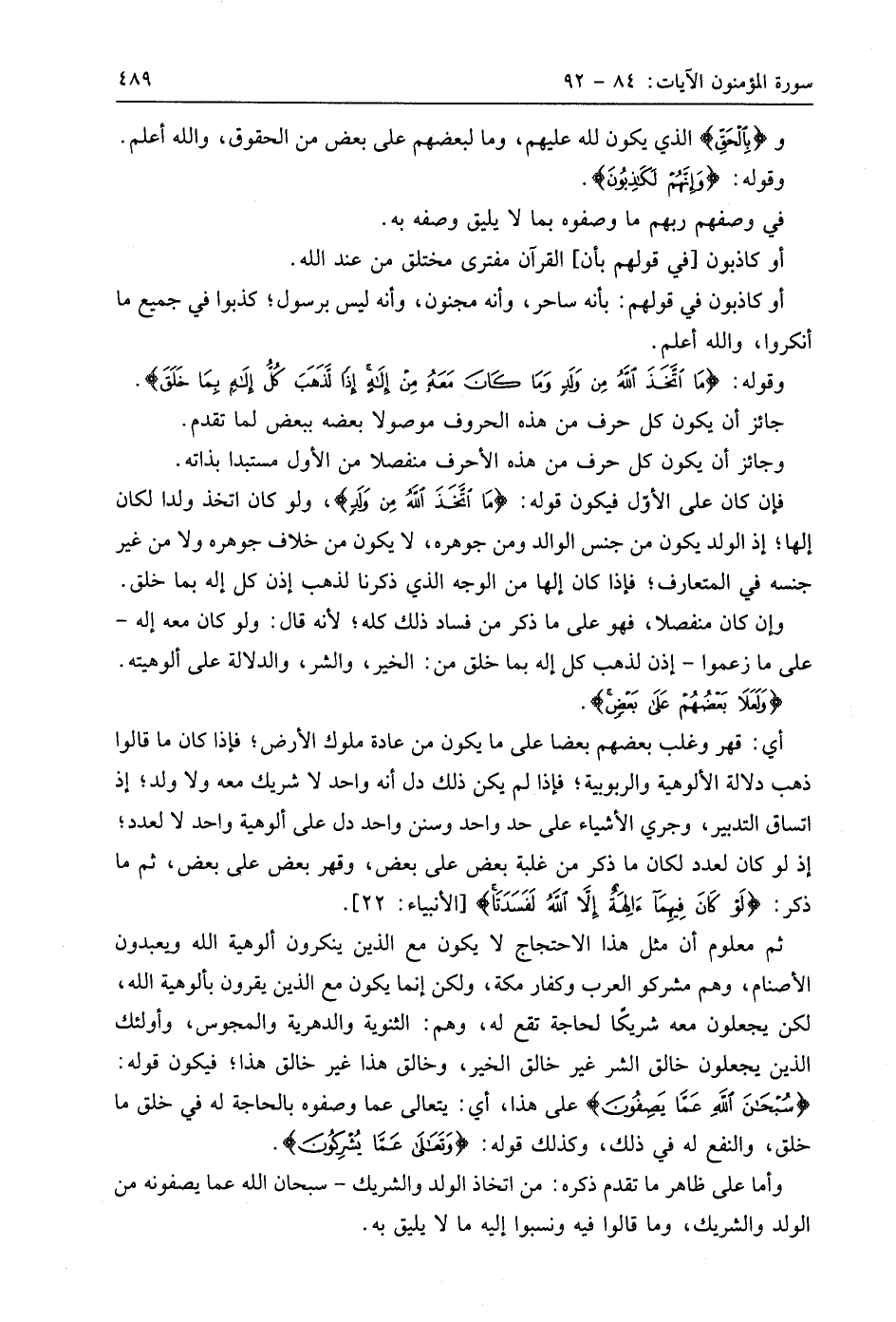 وقوله: (مَا اتَّخَذَ اللَّهُ مِنْ وَلَدٍ وَمَا كَانَ مَعَهُ مِنْ إِلَهٍ إِذًا لَذَهَبَ كُلُّ إِلَهٍ بِمَا خَلَقَ وَلَعَلَا بَعْضُهُمْ عَلَى بَعْضٍ سُبْحَانَ اللَّهِ عَمَّا يَصِفُونَ (91)