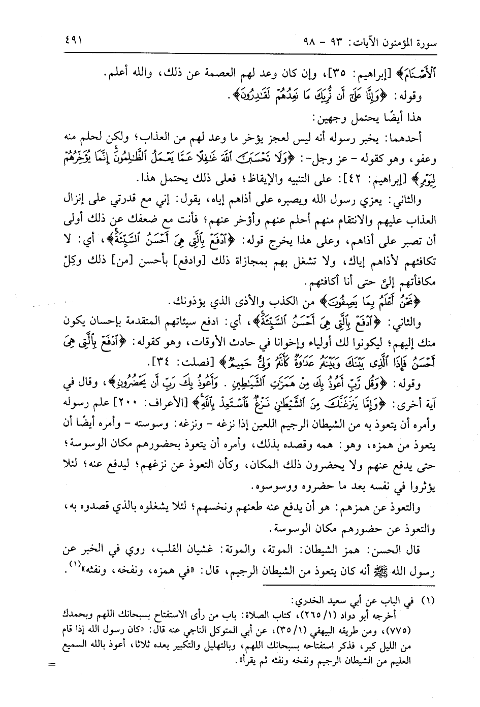 وقوله: (وَقُلْ رَبِّ أَعُوذُ بِكَ مِنْ هَمَزَاتِ الشَّيَاطِينِ (97) وَأَعُوذُ بِكَ رَبِّ أَنْ يَحْضُرُونِ (98) وقال في آية أخرى: (وَإِمَّا يَنْزَغَنَّكَ مِنَ الشَّيْطَانِ نَزْغٌ فَاسْتَعِذْ بِاللَّهِ)، علم رسوله وأمره أن يتعوذ به من الشيطان الرجيم اللعين إذا نزغه - ونزغه: وسوسته - وأمره أيضًا أن يتعوذ من همزه، وهو: همه وقصده بذلك، وأمره أن يتعوذ بحضورهم مكان الوسوسة؛ حتى يدفع عنهم ولا يحضرون ذلك المكان، وكأن التعوذ عن نزغهم؛ ليدفع عنه؛ لئلا يؤثروا في نفسه بعد ما حضروه ووسوسوه.