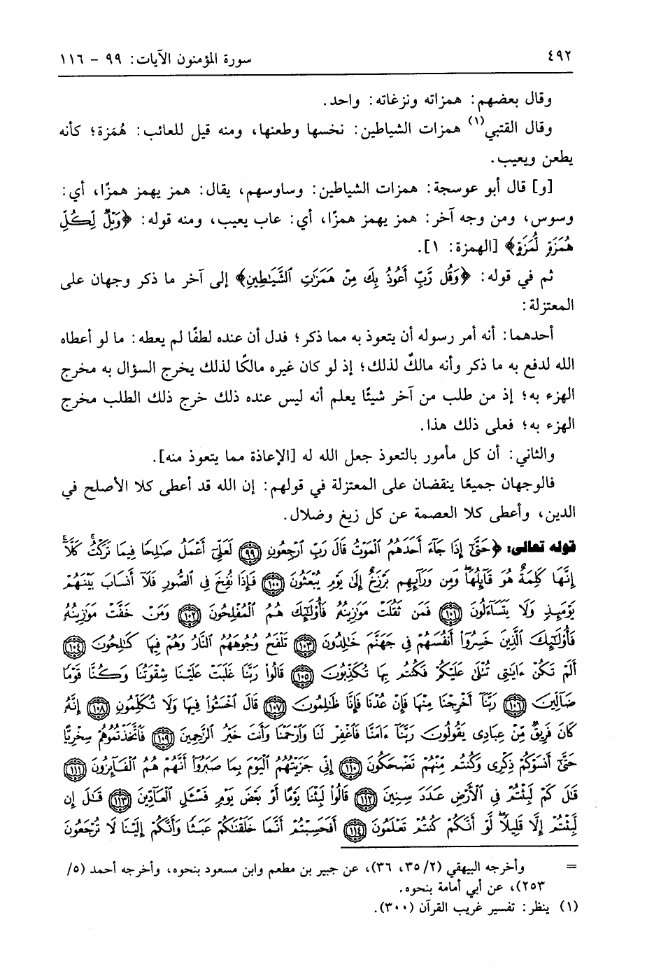 وقال أَبُو عَوْسَجَةَ: همزات الشياطين: وساوسهم، يقال: همز يهمز همزًا، أي: وسوس، ومن وجه آخر: همز يهمز همزا، أي: عاب يعيب، ومنه قوله: (وَيْلٌ لِكُلِّ هُمَزَةٍ لُمَزَةٍ).