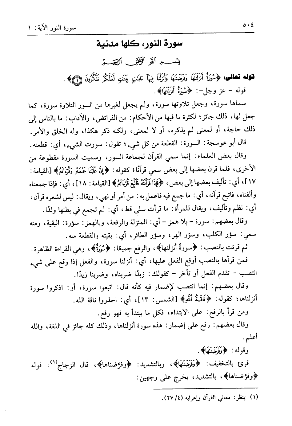 قوله - عَزَّ وَجَلَّ -: (سُورَةٌ أَنْزَلْنَاهَا).