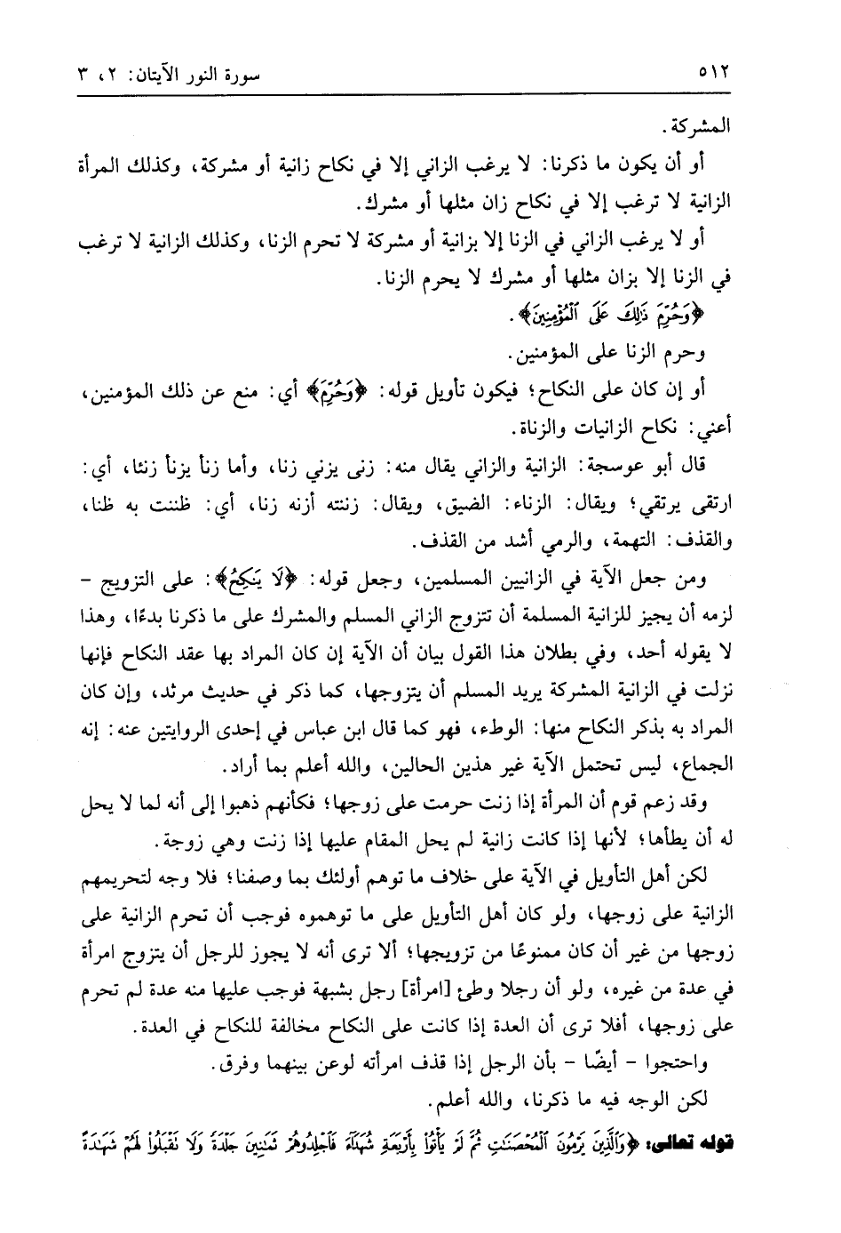 ومن جعل الآية في الزانيين المسلمين، وجعل قوله: (لَا يَنْكِحُ): على التزويج - لزمه أن يجيز للزانية المسلمة أن تتزوج الزاني المسلم والمشرك على ما ذكرنا بدءًا، وهذا لا يقوله أحد، وفي بطلان هذا القول بيان أن الآية إن كان المراد بها عقد النكاح فإنها نزلت في الزانية المشركة يريد المسلم أن يتزوجها، كما ذكر في حديث مرثد، وإن كان المراد به بذكر النكاح منها: الوطء، فهو كما قال ابن عَبَّاسٍ في إحدى الروايتين عنه: إنه الجماع، ليس تحتمل الآية غير هذين الحالين، واللَّه أعلم بما أراد.