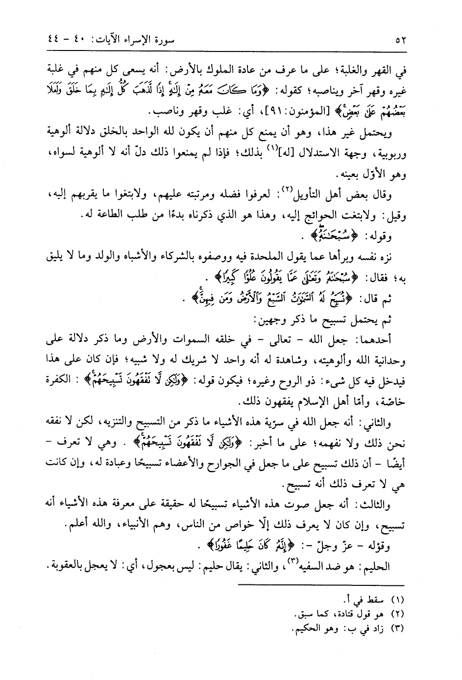 ثم قال: (تُسَبِّحُ لَهُ السَّمَاوَاتُ السَّبْعُ وَالْأَرْضُ وَمَنْ فِيهِنَّ وَإِنْ مِنْ شَيْءٍ إِلَّا يُسَبِّحُ بِحَمْدِهِ وَلَكِنْ لَا تَفْقَهُونَ تَسْبِيحَهُمْ إِنَّهُ كَانَ حَلِيمًا غَفُورًا (44)