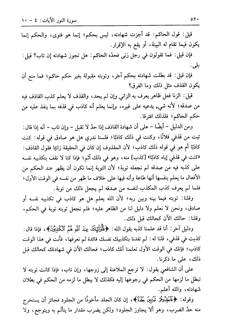 ودليل آخر: أنا قد علمنا كذبه بقول اللَّه: (فَأُولَئِكَ عِنْدَ اللَّهِ هُمُ الْكَاذِبُونَ)، فإذا قال: كذبت في قذفي، قلنا له: لم تفدنا بتكذيبك نفسك فائدة لم نعرفها، فأنت في هذا الوقت كاذب؛ فإنك في الوقت الأول تعلمنا أنك كاذب؛ فحالك الآن في شهادتك كحالك قبل ذلك، على ما ذكرنا.