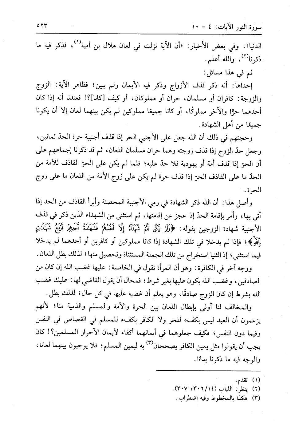 إحداها: أنه ذكر قذف الأزواج وذكر فيه الأيمان ولم يبين؛ فظاهر الآية: الزوج والزوجة: كافران أو مسلمان، حران أو مملوكان، أو كيف كانا؟! فعندنا أنه إذا كان أحدهما حرَّا والآخر مملوكًا، أو كانا جميعًا مملوكين لم يكن بينهما لعان إلا أن يكونا جميعًا من أهل الشهادة.