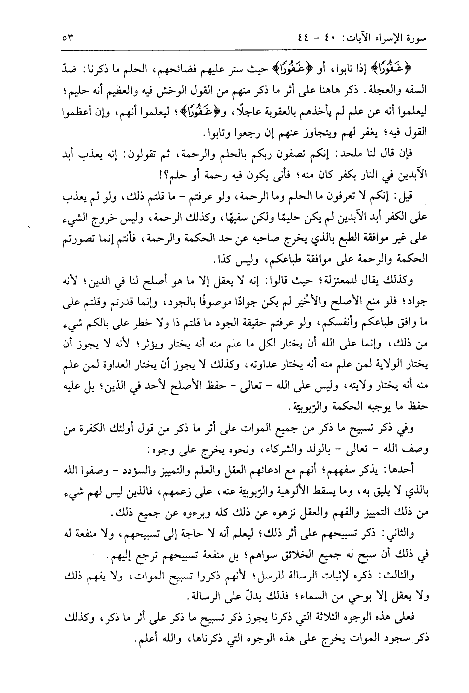 وكذلك يقال للمعتزلة؛ حيث قالوا: إنه لا يعقل إلا ما هو أصلح لنا في الدِّين؛ لأنه جواد؛ فلو منع الأصلح والأخْيَر لم يكن جوادًا موصوفا بالجود، وإنما قدرتم وقلتم على ما وافق طباعكم وأنفسكم، ولو عرفتم حقيقة الجود ما قلتم ذا ولا خطر على بالكم شيء من ذلك، وإنما على اللَّه أن يختار لكل ما علم منه أنه يختار ويؤثر؛ لأنه لا يجوز أن يختار الولاية لمن علم منه أنه يختار عداوته، وكذلك لا يجوز أن يختار العداوة لمن علم منه أنه يختار ولايته، وليس على اللَّه - تعالى - حفظ الأصلح لأحد في الذين؛ بل عليه حفظ ما يوجبه الحكمة والربوبية.