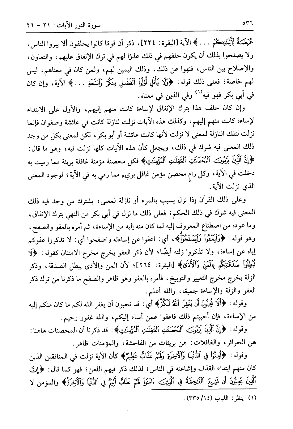 وإن كان حلف هذا بترك الإنفاق لإساءة كانت منهم إليهم، والأول على الابتداء لإساءة كانت منهم إليهم، وكذلك هذه الآيات نزلت لنازلة كانت في عائشة وصفوان فإنما نزلت لتلك النازلة لمعنى لا نزلت لأنها كانت عائشة أو أبو بكر، لكن لمعنى بكل من وجد ذلك المعنى فيه شرك في ذلك، ويجعل كان هذه الآيات كلها نزلت فيه، وهو ما قال: قوله تعالى: (إِنَّ الَّذِينَ يَرْمُونَ الْمُحْصَنَاتِ الْغَافِلَاتِ الْمُؤْمِنَاتِ) فكل محصنة مؤمنة غافلة بريئة مما رميت به دخلت في الآية، وكل رامٍ محصن مؤمن غافل بريء مما رمي به في الآية؛ لوجود المعنى الذي نزلت الآية.