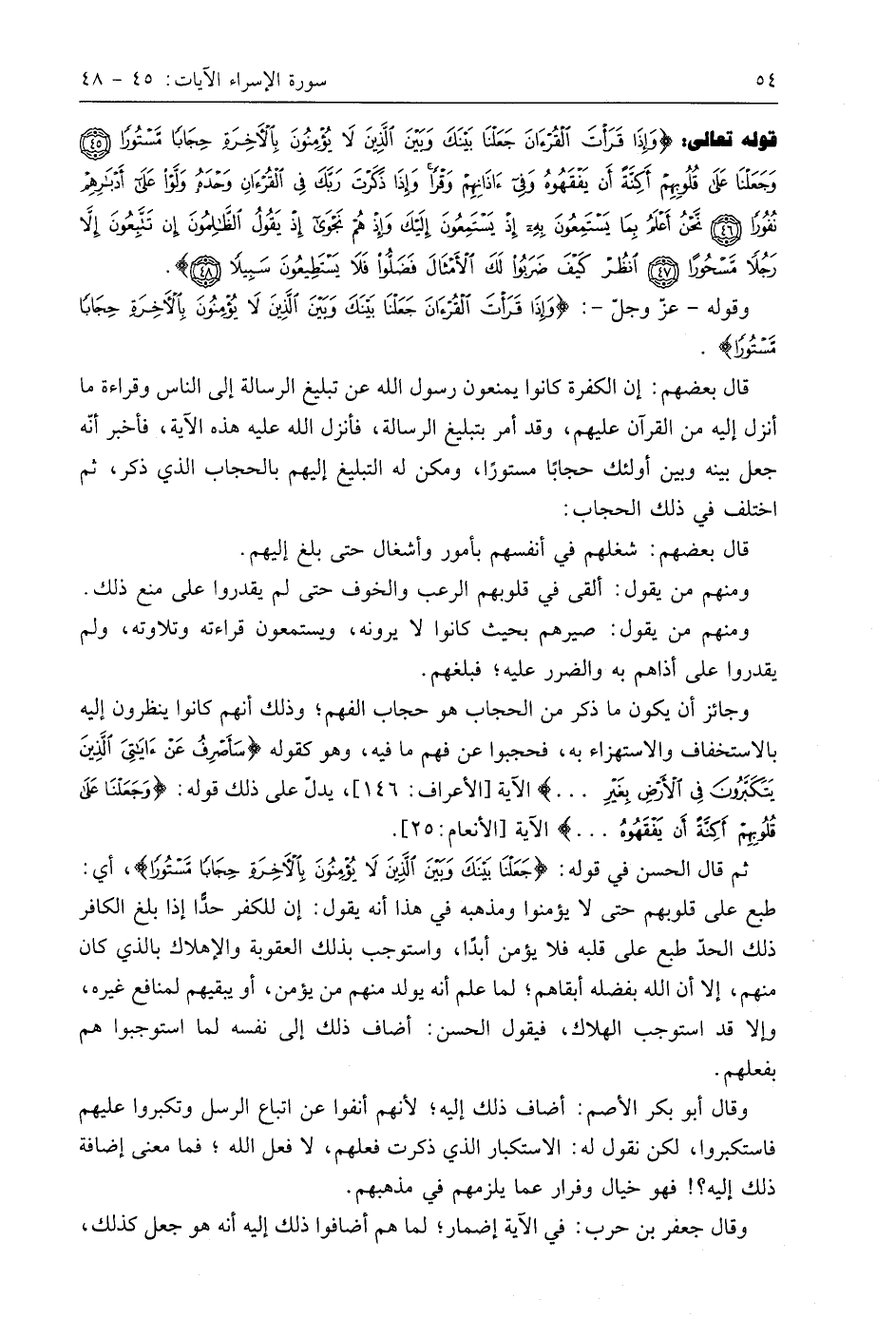 ثم قال الحسن في قوله: (جَعَلْنَا بَيْنَكَ وَبَيْنَ الَّذِينَ لَا يُؤْمِنُونَ بِالْآخِرَةِ حِجَابًا مَسْتُورًا)، أي: طبع على قلوبهم حتى لا يؤمنوا ومذهبه في هذا أنه يقول: إن للكفر حدًّا إذا بلغ الكافر ذلك الحد طبع على قلبه فلا يؤمن أبدًا، واستوجب بذلك العقوبة والإهلاك بالذي كان منهم، إلا أن اللَّه بفضله أبقاهم؛ لما علم أنه يولد منهم من يؤمن، أو يبقيهم لمنافع غيره، وإلا قد استوجب الهلاك، فيقول الحسن: أضاف ذلك إلى نفسه لما استوجبوا هم بفعلهم.