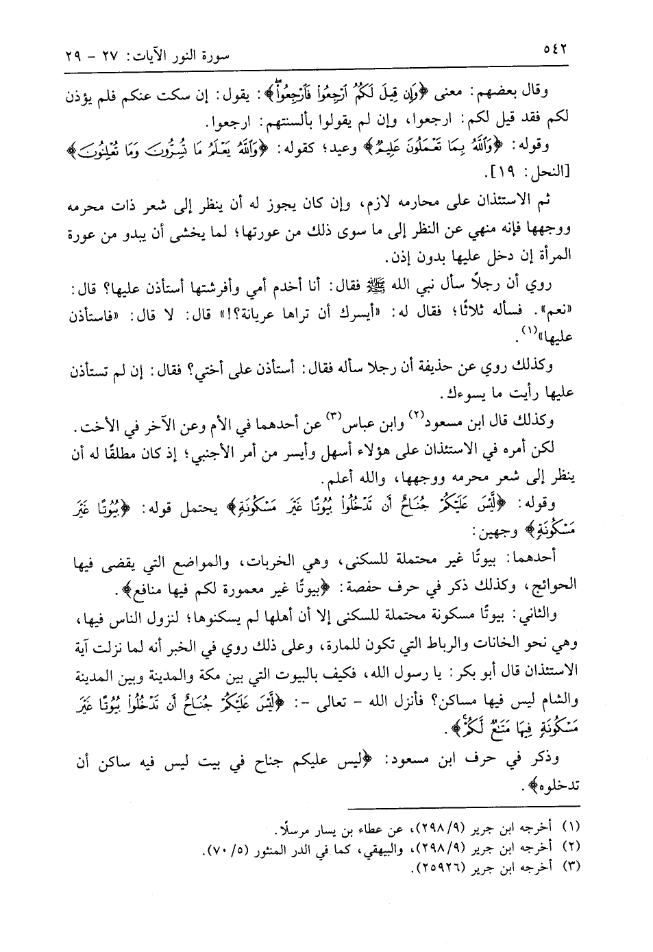 والثاني: بيوتًا مسكونة محتملة للسكنى إلا أن أهلها لم يسكنوها؛ لنزول الناس فيها، وهي نحو الخانات والرباط التي تكون للمارة، وعلى ذلك روي في الخبر أنه لما نزلت آية الاستئذان قال أبو بكر: يا رسول اللَّه، فكيف بالبيوت التي بين مكة والمدينة وبين المدينة والشام ليس فيها مساكن؟ فأنزل اللَّه - تعالى -: (لَيْسَ عَلَيْكُمْ جُنَاحٌ أَنْ تَدْخُلُوا بُيُوتًا غَيْرَ مَسْكُونَةٍ فِيهَا مَتَاعٌ لَكُمْ).