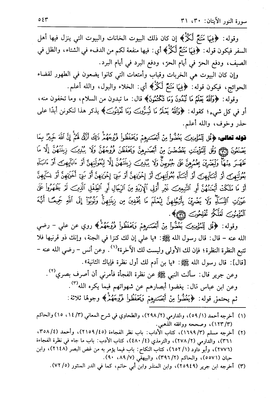 وقوله: (قُلْ لِلْمُؤْمِنِينَ يَغُضُّوا مِنْ أَبْصَارِهِمْ وَيَحْفَظُوا فُرُوجَهُمْ) روي عن علي - رضي اللَّه عنه - قال: قال رسول اللَّه - صَلَّى اللَّهُ عَلَيهِ وَسَلَّمَ -: " يا علي إن لك كنزا في الجنة، وإنك ذو قرنيها فلا تتبع النظرة النظرة؛ فإن لك الأولى وليست لك الآخرة ". وعن أنس - رَضِيَ اللَّهُ عَنْهُ - قال: قال رسول اللَّه - صَلَّى اللَّهُ عَلَيهِ وَسَلَّمَ -: " يا بن آدم لك أول نظرة فإياك الثانية ".
