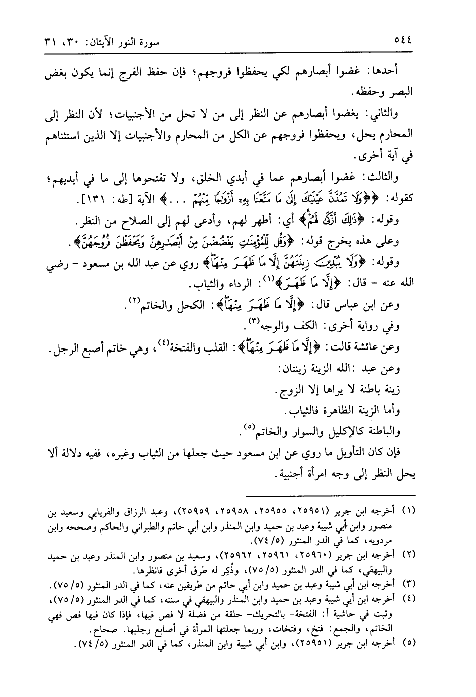 وعن ابن عَبَّاسٍ قال: (إِلَّا مَا ظَهَرَ مِنْهَا): الكحل والخاتم.