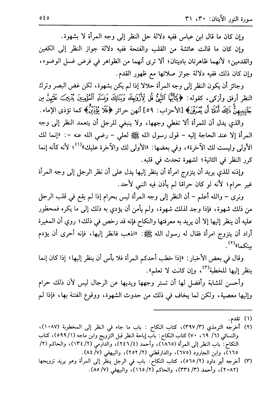 وجائز أن يكون النظر إلى وجه المرأة حلالا إذا لم يكن بشهوة، لكن غض البصر وترك النظر أرفق وأزكى، كقوله: (يَا أَيُّهَا النَّبِيُّ قُلْ لِأَزْوَاجِكَ وَبَنَاتِكَ وَنِسَاءِ الْمُؤْمِنِينَ يُدْنِينَ عَلَيْهِنَّ مِنْ جَلَابِيبِهِنَّ ذَلِكَ أَدْنَى أَنْ يُعْرَفْنَ فَلَا يُؤْذَيْنَ) كما تؤذى الإماء.