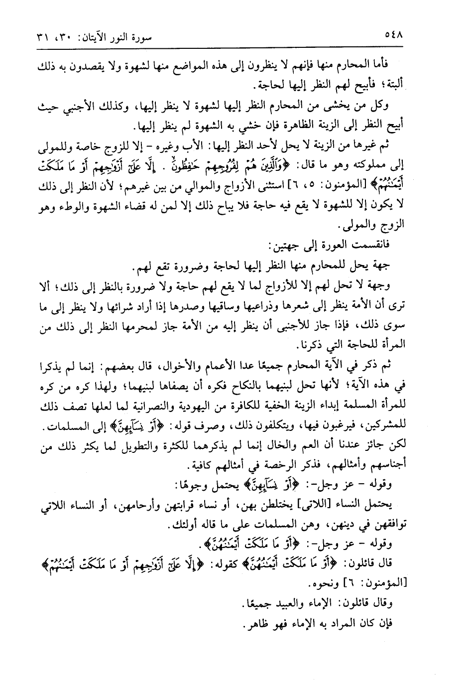 ثم غيرها من الزينة لا يحل لأحد النظر إليها: الأب وغيره - إلا للزوج خاصة وللمولى إلى مملوكته وهو ما قال: (وَالَّذِينَ هُمْ لِفُرُوجِهِمْ حَافِظُونَ (5) إِلَّا عَلَى أَزْوَاجِهِمْ أَوْ مَا مَلَكَتْ أَيْمَانُهُمْ)، استثنى الأزواج والموالي من بين غيرهم؛ لأن النظر إلى ذلك لا يكون إلا للشهوة لا يقع فيه حاجة فلا يباح ذلك إلا لمن له قضاء أن شهوة والوطء وهو الزوج والمولي.