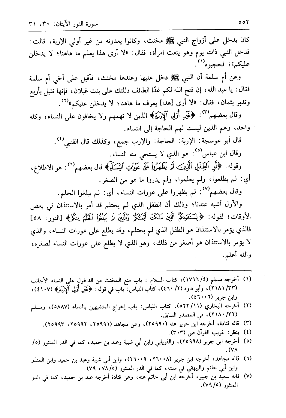 وقَالَ بَعْضُهُمْ: (غَيْرِ أُولِي الْإِرْبَةِ) الذين لا تهمهم ولا يخافون على النساء، وكله واحد، وهم الذين ليست لهم الحاجة إلى النساء.
