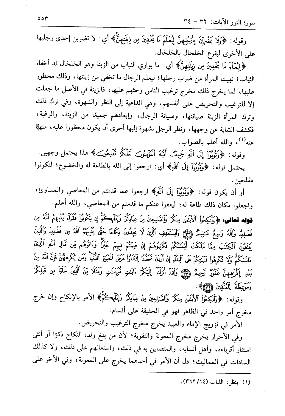 قوله تعالى: (وَأَنْكِحُوا الْأَيَامَى مِنْكُمْ وَالصَّالِحِينَ مِنْ عِبَادِكُمْ وَإِمَائِكُمْ إِنْ يَكُونُوا فُقَرَاءَ يُغْنِهِمُ اللَّهُ مِنْ فَضْلِهِ وَاللَّهُ وَاسِعٌ عَلِيمٌ (32) وَلْيَسْتَعْفِفِ الَّذِينَ لَا يَجِدُونَ نِكَاحًا حَتَّى يُغْنِيَهُمُ اللَّهُ مِنْ فَضْلِهِ وَالَّذِينَ يَبْتَغُونَ الْكِتَابَ مِمَّا مَلَكَتْ أَيْمَانُكُمْ فَكَاتِبُوهُمْ إِنْ عَلِمْتُمْ فِيهِمْ خَيْرًا وَآتُوهُمْ مِنْ مَالِ اللَّهِ الَّذِي آتَاكُمْ وَلَا تُكْرِهُوا فَتَيَاتِكُمْ عَلَى الْبِغَاءِ إِنْ أَرَدْنَ تَحَصُّنًا لِتَبْتَغُوا عَرَضَ الْحَيَاةِ الدُّنْيَا وَمَنْ يُكْرِهْهُنَّ فَإِنَّ اللَّهَ مِنْ بَعْدِ إِكْرَاهِهِنَّ غَفُورٌ رَحِيمٌ (33) وَلَقَدْ أَنْزَلْنَا إِلَيْكُمْ آيَاتٍ مُبَيِّنَاتٍ وَمَثَلًا مِنَ الَّذِينَ خَلَوْا مِنْ قَبْلِكُمْ وَمَوْعِظَةً لِلْمُتَّقِينَ (34)