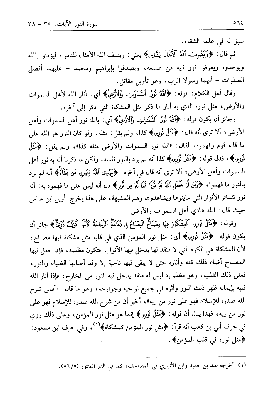 وقوله: (مَثَلُ نُورِهِ كَمِشْكَاةٍ فِيهَا مِصْبَاحٌ الْمِصْبَاحُ فِي زُجَاجَةٍ الزُّجَاجَةُ كَأَنَّهَا كَوْكَبٌ دُرِّيٌّ) جائز أن يكون قوله: (مَثَلُ نُورِهِ) أي: مثل نور المؤمن الذي في قلبه مثل مشكاة فيها مصباح؛ لأن المشكاة هي الكوة التي لا منفذ لها يدخل فيها الأنوار، فتكون مظلمة، فإذا جعل فيها المصباح أضاء ذلك كله وأناره حتى لا يبقى فيها ناحية إلا وقد أصابها الضياء والنور، فعلى ذلك القلب، وهو مظلم إذ ليس له منفذ يدخل فيه النور من الخارج، فإذا أنار الله قلبه بإيمانه ظهر ذلك النور وأثره في جميع نواحيه وجوارحه، وهو ما قال: " أَفَمَنْ شَرَحَ اللَّهُ صَدْرَهُ لِلْإِسْلَامِ فَهُوَ عَلَى نُورٍ مِنْ رَبِّهِ "، أخبر أن من شرح اللَّه صدره للإسلام فهو على نور من ربه، فهذا يدل أن قوله: (مَثَلُ نُورِهِ) إنما هو مثل نور المؤمن، وعلى ذلك روي في حرف أبي بن كعب أنه قرأ: (مثل نور المؤمن كمشكاة)، وفي حرف ابن مسعود: (مثل نوره في قلب المؤمن).