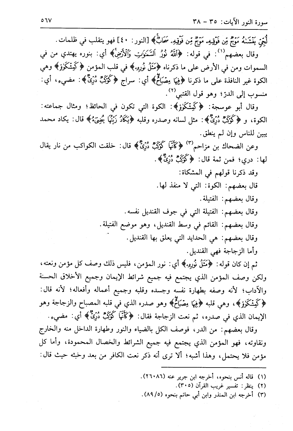 وقال أَبُو عَوْسَجَةَ: (كَمِشْكَاةٍ): الكوة التي تكون في الحائط؛ ومثال جماعته: الكوة، (كَوْكَبٌ دُرِّيٌّ): مثل لسانه وصدره وقلبه (يَكَادُ زَيْتُهَا يُضِيءُ) قال: يكاد محمد يبين للناس وإن لم ينطق.
