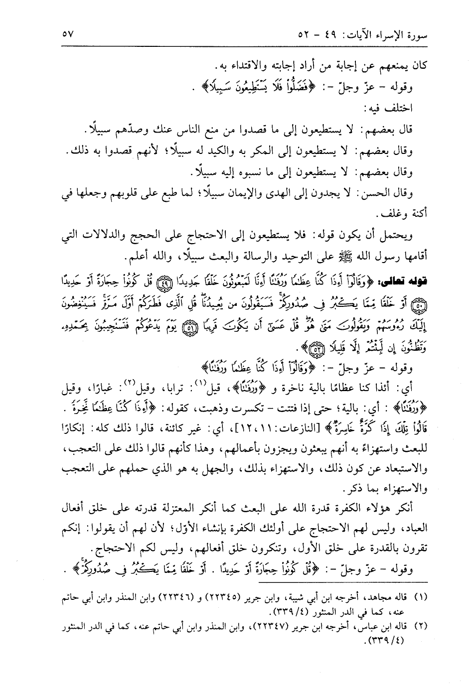 وقوله - عزّ وجلّ -: (قُلْ كُونُوا حِجَارَةً أَوْ حَدِيدًا (50) أَوْ خَلْقًا مِمَّا يَكْبُرُ فِي صُدُورِكُمْ).