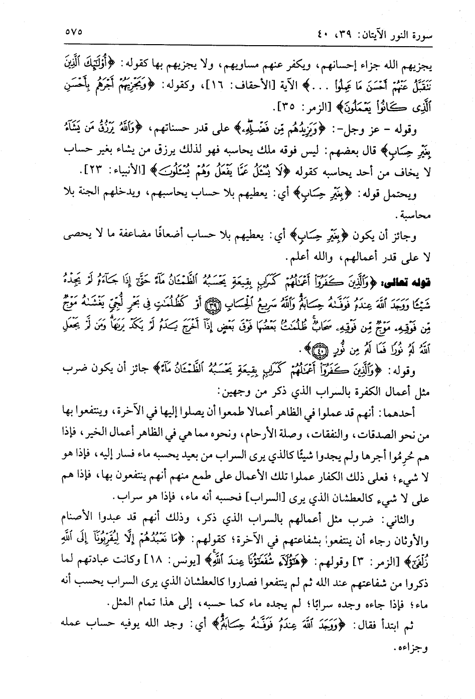 قوله تعالى: (وَالَّذِينَ كَفَرُوا أَعْمَالُهُمْ كَسَرَابٍ بِقِيعَةٍ يَحْسَبُهُ الظَّمْآنُ مَاءً حَتَّى إِذَا جَاءَهُ لَمْ يَجِدْهُ شَيْئًا وَوَجَدَ اللَّهَ عِنْدَهُ فَوَفَّاهُ حِسَابَهُ وَاللَّهُ سَرِيعُ الْحِسَابِ (39) أَوْ كَظُلُمَاتٍ فِي بَحْرٍ لُجِّيٍّ يَغْشَاهُ مَوْجٌ مِنْ فَوْقِهِ مَوْجٌ مِنْ فَوْقِهِ سَحَابٌ ظُلُمَاتٌ بَعْضُهَا فَوْقَ بَعْضٍ إِذَا أَخْرَجَ يَدَهُ لَمْ يَكَدْ يَرَاهَا وَمَنْ لَمْ يَجْعَلِ اللَّهُ لَهُ نُورًا فَمَا لَهُ مِنْ نُورٍ (40)