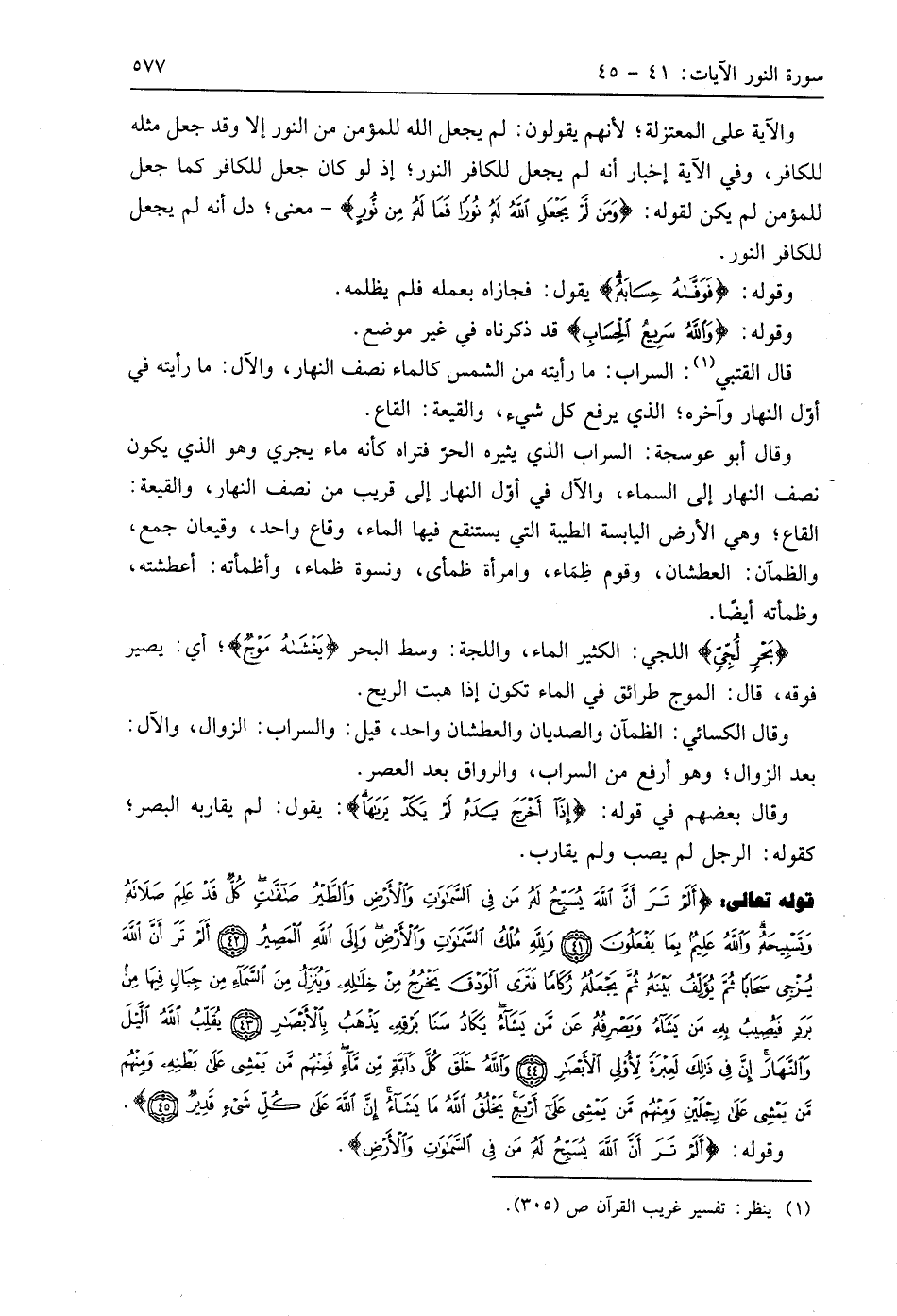 والآية على المعتزلة؛ لأنهم يقولون: لم يجعل اللَّه للمؤمن من النور إلا وقد جعل مثله للكافر، وفي الآية إخبار أنه لم يجعل للكافر النور؛ إذ لو كان جعل للكافر كما جعل للمؤمن لم يكن لقوله: (وَمَنْ لَمْ يَجْعَلِ اللَّهُ لَهُ نُورًا فَمَا لَهُ مِنْ نُورٍ) - معنى؛ دل أنه لم يجعل للكافر النور.
