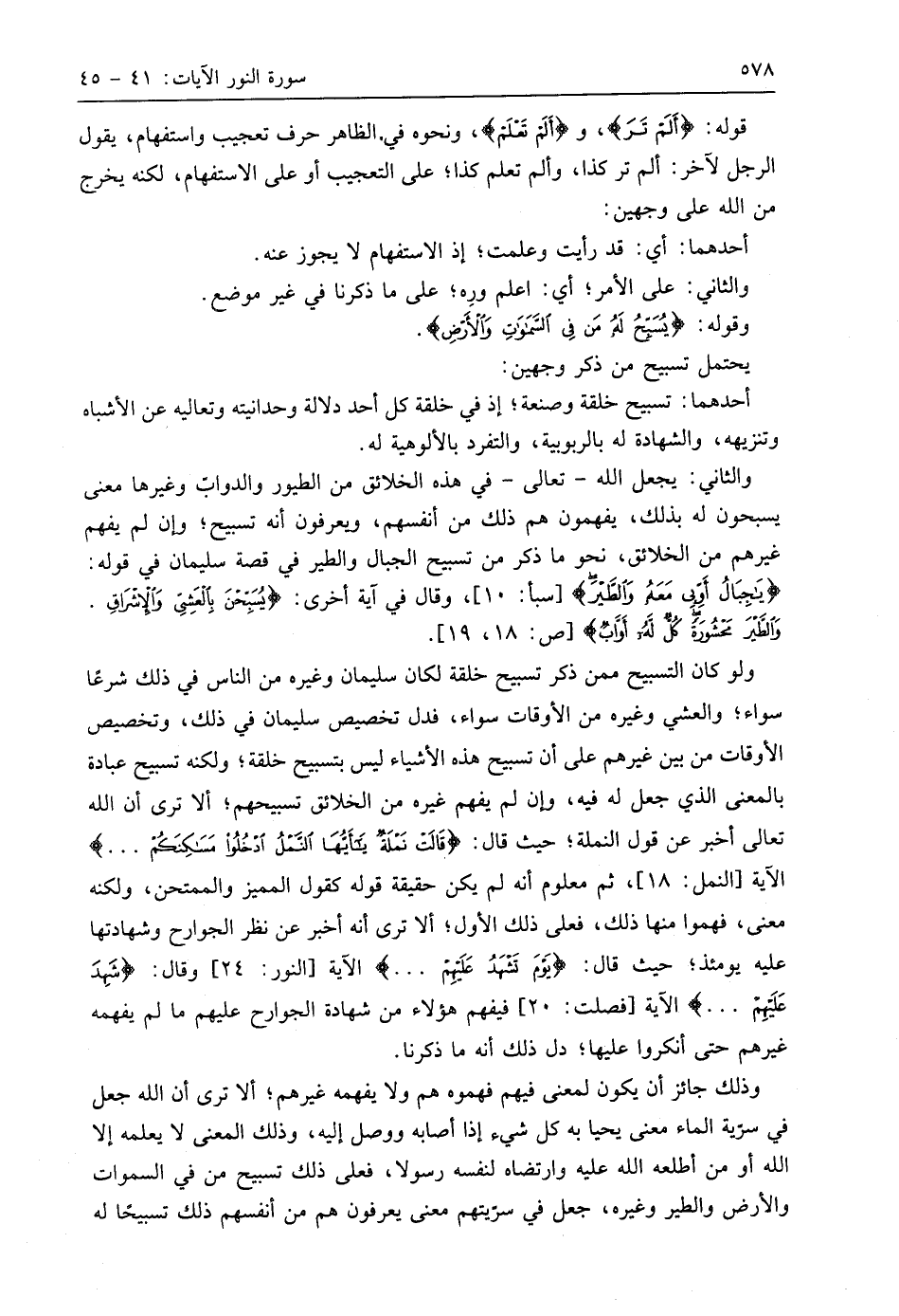 ولو كان التسبيح ممن ذكر تسبيح خلقة لكان سليمان وغيره من الناس في ذلك شرعًا سواء؛ والعشي وغيره من الأوقات سواء، فدل تخصيص سليمان في ذلك، وتخصيص الأوقات من بين غيرهم على أن تسبيح هذه الأشياء ليس بتسبيح خلقة؛ ولكنه تسبيح عبادة بالمعنى الذي جعل له فيه، وإن لم يفهم غيره من الخلائق تسبيحهم؛ ألا ترى أن الله تعالى أخبر عن قول النملة؛ حيث قال: (قَالَتْ نَمْلَةٌ يَا أَيُّهَا النَّمْلُ ادْخُلُوا مَسَاكِنَكُمْ. . .) الآية، ثم معلوم أنه لم يكن حقيقة قوله كقول المميز والممتحن، ولكنه معنى، فهموا منها ذلك، فعلى ذلك الأول؛ ألا ترى أنه أخبر عن نظر الجوارح وشهادتها عليه يومئذ؛ حيث قال: (يَوْمَ تشْهَدُ عَلَيهِم. . .) الآية، وقال: (شَهِدَ عَليهِم. . .) الآية، فيفهم هَؤُلَاءِ من شهادة الجوارح عليهم ما لم يفهمه غيرهم حتى أنكروا عليها؛ دل ذلك أنه ما ذكرنا.