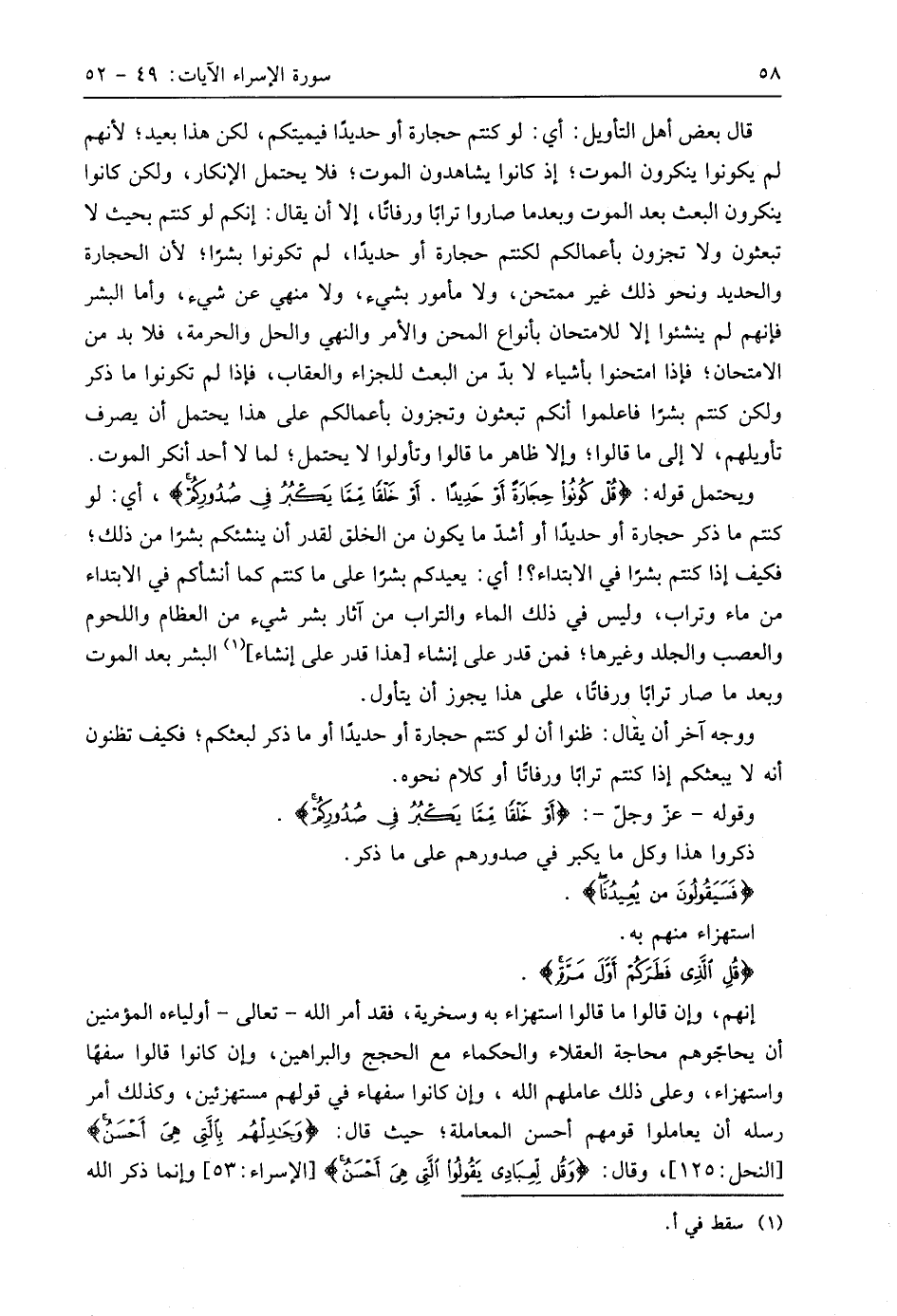 ويحتمل قوله: (قُلْ كُونُوا حِجَارَةً أَوْ حَدِيدًا (50) أَوْ خَلْقًا مِمَّا يَكْبُرُ فِي صُدُورِكُمْ)، أي: لو كنتم ما ذكر حجارة أو حديدًا أو أشد ما يكون من الخلق لقدر أن ينشئكم بشرًا من ذلك؛ فكيف إذا كنتم بشرًا في الابتداء؟! أي: يعيدكم بشرًا على ما كنتم كما أنشأكم في الابتداء من ماء وتراب، وليس في ذلك الماء والتراب من آثار بشر شيء من العظام واللحوم والعصب والجلد وغيرها؛ فمن قدر على إنشاء هذا قدر على إنشاء البشر بعد الموت وبعد ما صار ترابًا ورفاتًا، على هذا يجوز أن يتأول.