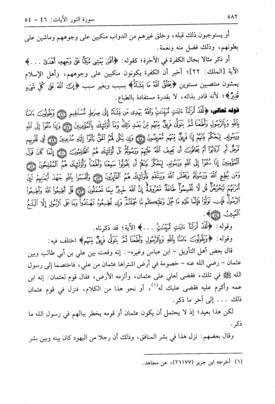 قوله تعالى: (لَقَدْ أَنْزَلْنَا آيَاتٍ مُبَيِّنَاتٍ وَاللَّهُ يَهْدِي مَنْ يَشَاءُ إِلَى صِرَاطٍ مُسْتَقِيمٍ (46) وَيَقُولُونَ آمَنَّا بِاللَّهِ وَبِالرَّسُولِ وَأَطَعْنَا ثُمَّ يَتَوَلَّى فَرِيقٌ مِنْهُمْ مِنْ بَعْدِ ذَلِكَ وَمَا أُولَئِكَ بِالْمُؤْمِنِينَ (47) وَإِذَا دُعُوا إِلَى اللَّهِ وَرَسُولِهِ لِيَحْكُمَ بَيْنَهُمْ إِذَا فَرِيقٌ مِنْهُمْ مُعْرِضُونَ (48) وَإِنْ يَكُنْ لَهُمُ الْحَقُّ يَأْتُوا إِلَيْهِ مُذْعِنِينَ (49) أَفِي قُلُوبِهِمْ مَرَضٌ أَمِ ارْتَابُوا أَمْ يَخَافُونَ أَنْ يَحِيفَ اللَّهُ عَلَيْهِمْ وَرَسُولُهُ بَلْ أُولَئِكَ هُمُ الظَّالِمُونَ (50) إِنَّمَا كَانَ قَوْلَ الْمُؤْمِنِينَ إِذَا دُعُوا إِلَى اللَّهِ وَرَسُولِهِ لِيَحْكُمَ بَيْنَهُمْ أَنْ يَقُولُوا سَمِعْنَا وَأَطَعْنَا وَأُولَئِكَ هُمُ الْمُفْلِحُونَ (51) وَمَنْ يُطِعِ اللَّهَ وَرَسُولَهُ وَيَخْشَ اللَّهَ وَيَتَّقْهِ فَأُولَئِكَ هُمُ الْفَائِزُونَ (52) وَأَقْسَمُوا بِاللَّهِ جَهْدَ أَيْمَانِهِمْ لَئِنْ أَمَرْتَهُمْ لَيَخْرُجُنَّ قُلْ لَا تُقْسِمُوا طَاعَةٌ مَعْرُوفَةٌ إِنَّ اللَّهَ خَبِيرٌ بِمَا تَعْمَلُونَ (53) قُلْ أَطِيعُوا اللَّهَ وَأَطِيعُوا الرَّسُولَ فَإِنْ تَوَلَّوْا فَإِنَّمَا عَلَيْهِ مَا حُمِّلَ وَعَلَيْكُمْ مَا حُمِّلْتُمْ وَإِنْ تُطِيعُوهُ تَهْتَدُوا وَمَا عَلَى الرَّسُولِ إِلَّا الْبَلَاغُ الْمُبِينُ (54)