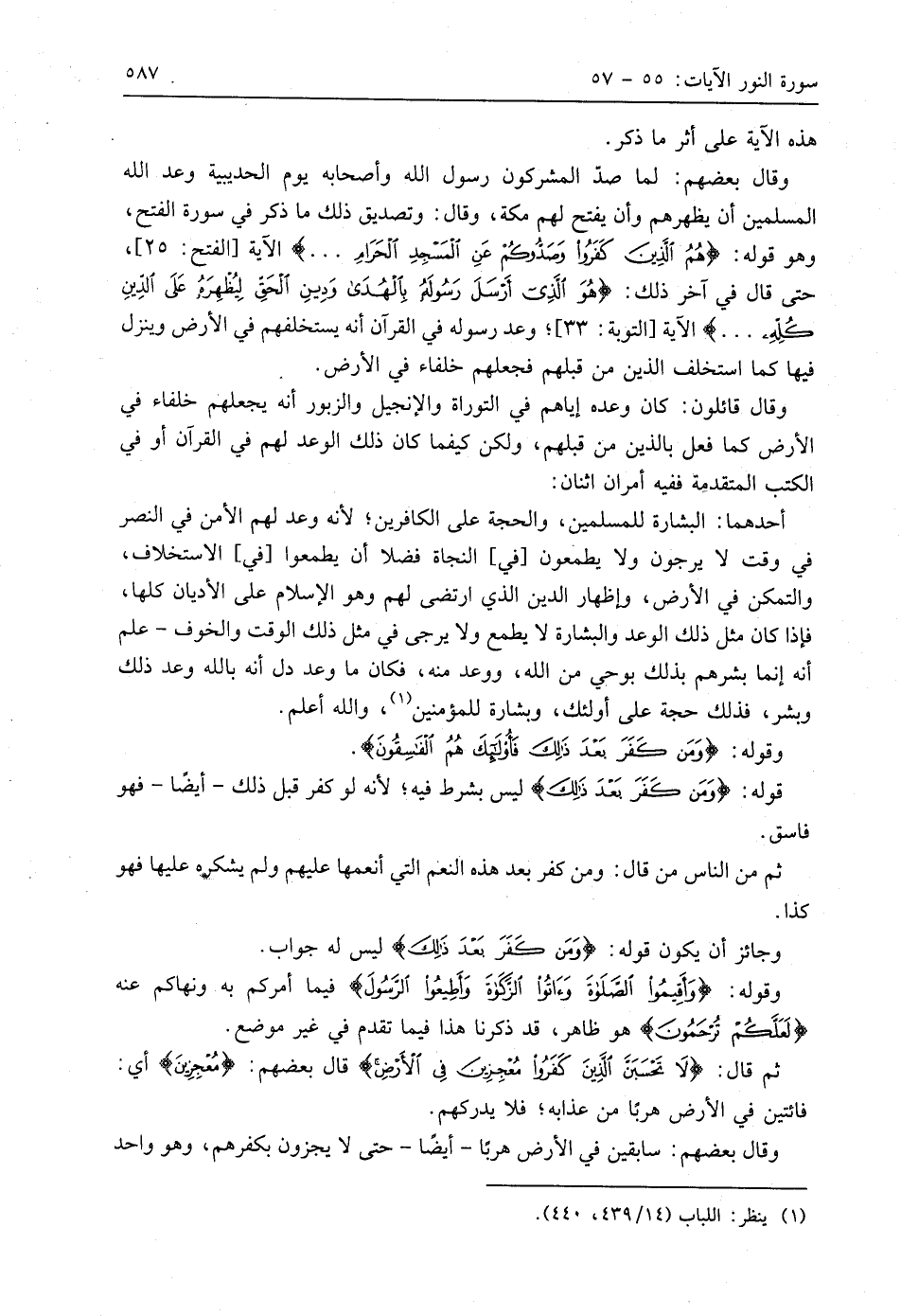 وقَالَ بَعْضُهُمْ: لما صدّ المشركون رسول اللَّه وأصحابه يوم الحديبية وعد الله المسلمين أن يظهرهم وأن يفتح لهم مكة، وقال: وتصديق ذلك ما ذكر في سورة الفتح، وهو قوله: (هُمُ الَّذِينَ كَفَرُوا وَصَدُّوكُمْ عَنِ الْمَسْجِدِ الْحَرَامِ. . .) الآية، حتى قال في آخر ذلك: (هُوَ الَّذِي أَرْسَلَ رَسُولَهُ بِالْهُدَى وَدِينِ الْحَقِّ لِيُظْهِرَهُ عَلَى الدِّينِ كُلِّهِ. . .) الآية؛ وعد رسوله في القرآن أنه يستخلفهم في الأرض وينزل فيها كما استخلف الذين من قبلهم فجعلهم خلفاء في الأرض.