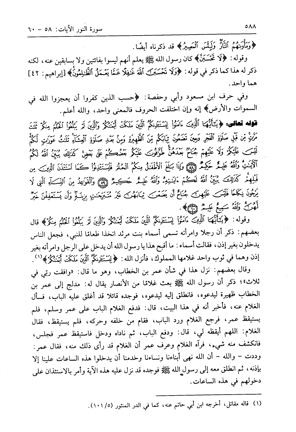 قوله تعالى: (يَا أَيُّهَا الَّذِينَ آمَنُوا لِيَسْتَأْذِنْكُمُ الَّذِينَ مَلَكَتْ أَيْمَانُكُمْ وَالَّذِينَ لَمْ يَبْلُغُوا الْحُلُمَ مِنْكُمْ ثَلَاثَ مَرَّاتٍ مِنْ قَبْلِ صَلَاةِ الْفَجْرِ وَحِينَ تَضَعُونَ ثِيَابَكُمْ مِنَ الظَّهِيرَةِ وَمِنْ بَعْدِ صَلَاةِ الْعِشَاءِ ثَلَاثُ عَوْرَاتٍ لَكُمْ لَيْسَ عَلَيْكُمْ وَلَا عَلَيْهِمْ جُنَاحٌ بَعْدَهُنَّ طَوَّافُونَ عَلَيْكُمْ بَعْضُكُمْ عَلَى بَعْضٍ كَذَلِكَ يُبَيِّنُ اللَّهُ لَكُمُ الْآيَاتِ وَاللَّهُ عَلِيمٌ حَكِيمٌ (58) وَإِذَا بَلَغَ الْأَطْفَالُ مِنْكُمُ الْحُلُمَ فَلْيَسْتَأْذِنُوا كَمَا اسْتَأْذَنَ الَّذِينَ مِنْ قَبْلِهِمْ كَذَلِكَ يُبَيِّنُ اللَّهُ لَكُمْ آيَاتِهِ وَاللَّهُ عَلِيمٌ حَكِيمٌ (59) وَالْقَوَاعِدُ مِنَ النِّسَاءِ اللَّاتِي لَا يَرْجُونَ نِكَاحًا فَلَيْسَ عَلَيْهِنَّ جُنَاحٌ أَنْ يَضَعْنَ ثِيَابَهُنَّ غَيْرَ مُتَبَرِّجَاتٍ بِزِينَةٍ وَأَنْ يَسْتَعْفِفْنَ خَيْرٌ لَهُنَّ وَاللَّهُ سَمِيعٌ عَلِيمٌ (60)