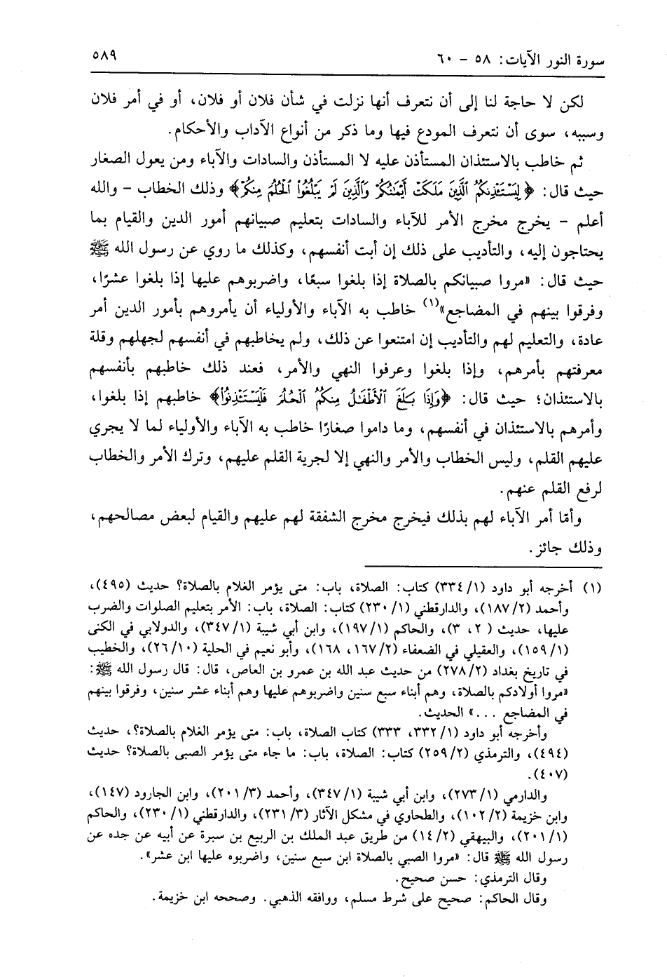 ثم خاطب بالاستئذان المستأذن عليه لا المستأذن والسادات والآباء ومن يعول الصغار حيث قال: (لِيَسْتَأْذِنْكُمُ الَّذِينَ مَلَكَتْ أَيْمَانُكُمْ وَالَّذِينَ لَمْ يَبْلُغُوا الْحُلُمَ مِنْكُمْ) وذلك الخطاب - والله أعلم - يخرج مخرج الأمر للآباء والسادات بتعليم صبيانهم أمور الدِّين والقيام بما يحتاجون إليه، والتأديب على ذلك إن أبت أنفسهم، وكذلك ما روي عن رسول اللَّه - صَلَّى اللَّهُ عَلَيهِ وَسَلَّمَ - حيث قال: " مروا صبيانكم بالصلاة إذا بلغوا سبعًا، واضربوهم عليها إذا بلغوا عشرًا، وفرقوا بينهم في المضاجع " خاطب به الآباء والأولياء أن يأمروهم بأمور الدِّين أمر عادة، والتعليم لهم والتأديب إن امتنعوا عن ذلك، ولم يخاطبهم في أنفسهم لجهلهم وقلة معرفتهم بأمرهم، وإذا بلغوا وعرفوا النهي والأمر، فعند ذلك خاطبهم بأنفسهم بالاستئذان؛ حيث قال: (وَإِذَا بَلَغَ الْأَطْفَالُ مِنْكُمُ الْحُلُمَ فَلْيَسْتَأْذِنُوا) خاطبهم إذا بلغوا، وأمرهم بالاستئذان في أنفسهم، وما داموا صغارًا خاطب به الآباء والأولياء لما لا يجري عليهم القلم، وليس الخطاب والأمر والنهي إلا لجرية القلم عليهم، وترك الأمر والخطاب لرفع القلم عنهم.