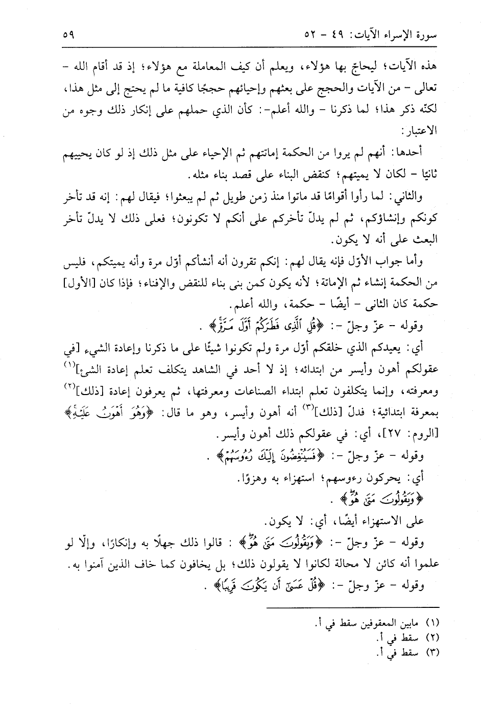 وأما جواب الأول فإنه يقال لهم: إنكم تقرون أنه أنشأكم أول مرة وأنه يميتكم، فليس من الحكمة إنشاء ثم الإماتة؛ لأنه يكون كمن بني بناء للنقض والإفناء؛ فإذا كان الأول، حكمة كان الثاني -أيضًا- حكمة، واللَّه أعلم.