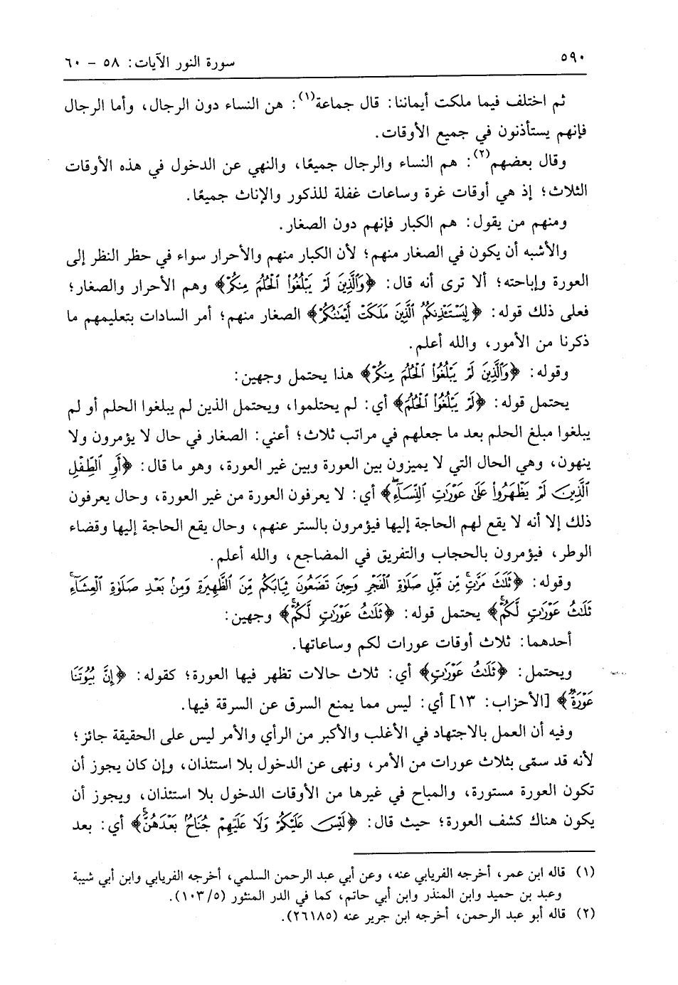 وقوله: (ثَلَاثَ مَرَّاتٍ مِنْ قَبْلِ صَلَاةِ الْفَجْرِ وَحِينَ تَضَعُونَ ثِيَابَكُمْ مِنَ الظَّهِيرَةِ وَمِنْ بَعْدِ صَلَاةِ الْعِشَاءِ ثَلَاثُ عَوْرَاتٍ لَكُمْ) يحتمل قوله: (ثَلَاثُ عَوْرَاتٍ لَكُمْ) وجهين: