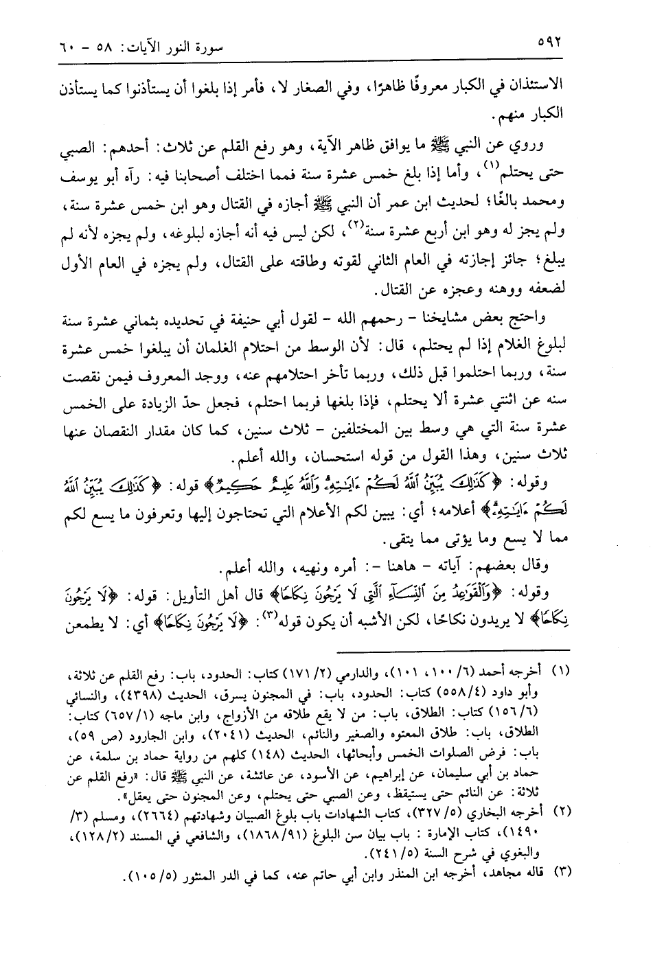 وروي عن النبي - صَلَّى اللَّهُ عَلَيهِ وَسَلَّمَ - ما يوافق ظاهر الآية، وهو رفع القلم عن ثلاث: أحدهم: الصبي حتى يحتلم، وأما إذا بلغ خمس عشرة سنة فمما اختلف أصحابنا فيه: رآه أبو يوسف ومُحَمَّد بالغًا؛ لحديث ابن عمر أن النبي - صَلَّى اللَّهُ عَلَيهِ وَسَلَّمَ - أجازه في القتال وهو ابن خمس عشرة سنة، ولم يجز له وهو ابن أربع عشرة سنة، لكن ليس فيه أنه أجازه لبلوغه، ولم يجزه لأنه لم يبلغ؛ جائز إجازته في العام الثاني لقوته وطاقته على القتال، ولم يجزه في العام الأول لضعفه ووهنه وعجزه عن القتال.