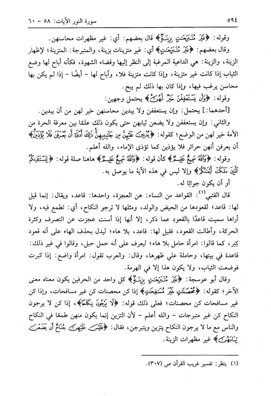 وقال أَبُو عَوْسَجَةَ: (غَيْرَ مُتَبَرِّجَاتٍ بِزِينَةٍ) كل واحد من الحرفين يكون معناه معنى الآخر؛ كقوله: (مُحْصَنَاتٍ غَيْرَ مُسَافِحَاتٍ) إذا كن محصنات كن غير مسافحات، وإذا كن غير مسافحات كن محصنات؛ فعلى ذلك قوله: (لَا يَرْجُونَ نِكَاحًا)، إذا كن لا يرجون النكاح كن غير متبرجات - واللَّه أعلم - لأن التزين إنما يكون منهن طمعًا في النكاح والناس مع ما لا يرجون النكاح يتزين ويتبرجن، فقال: (فَلَيْسَ عَلَيْهِنَّ جُنَاحٌ أَنْ يَضَعْنَ ثِيَابَهُنَّ) غير مظهرات الزينة.