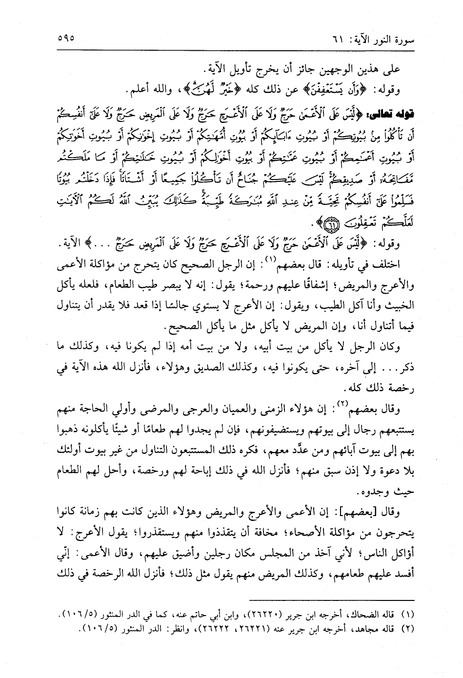 وقوله: (لَيْسَ عَلَى الْأَعْمَى حَرَجٌ وَلَا عَلَى الْأَعْرَجِ حَرَجٌ وَلَا عَلَى الْمَرِيضِ حَرَجٌ. . .) الآية.