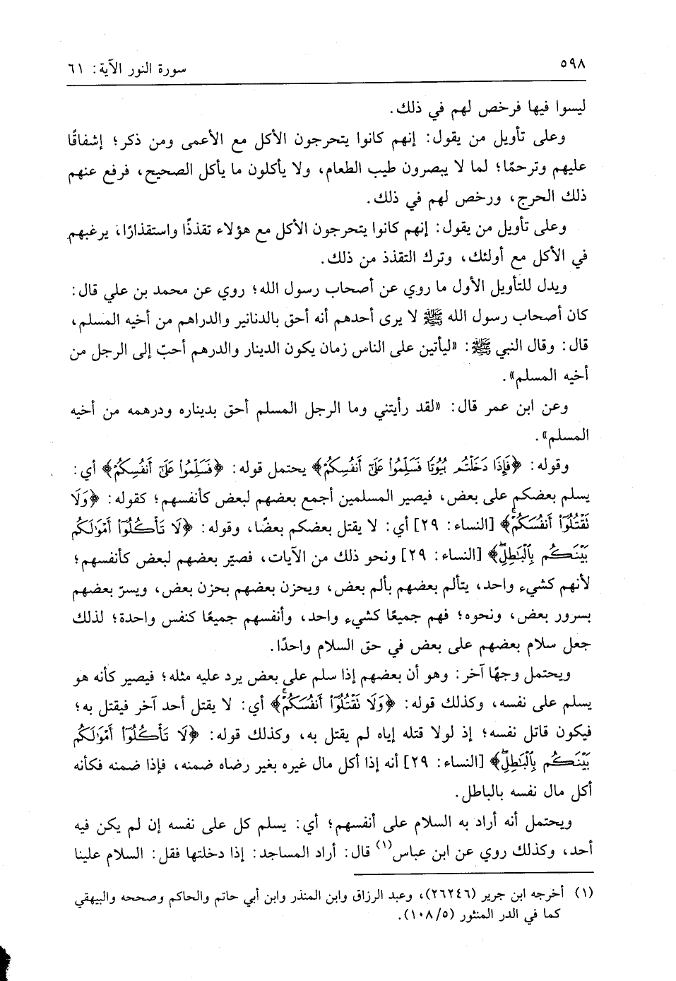 وعلى تأويل من يقول: إنهم كانوا يتحرجون الأكل مع الأعمى ومن ذكر؛ إشفاقًا عليهم وترحمًا؛ لما لا يبصرون طيب الطعام، ولا يأكلون ما يأكل الصحيح، فرفع عنهم ذلك الحرج، ورخص لهم في ذلك.