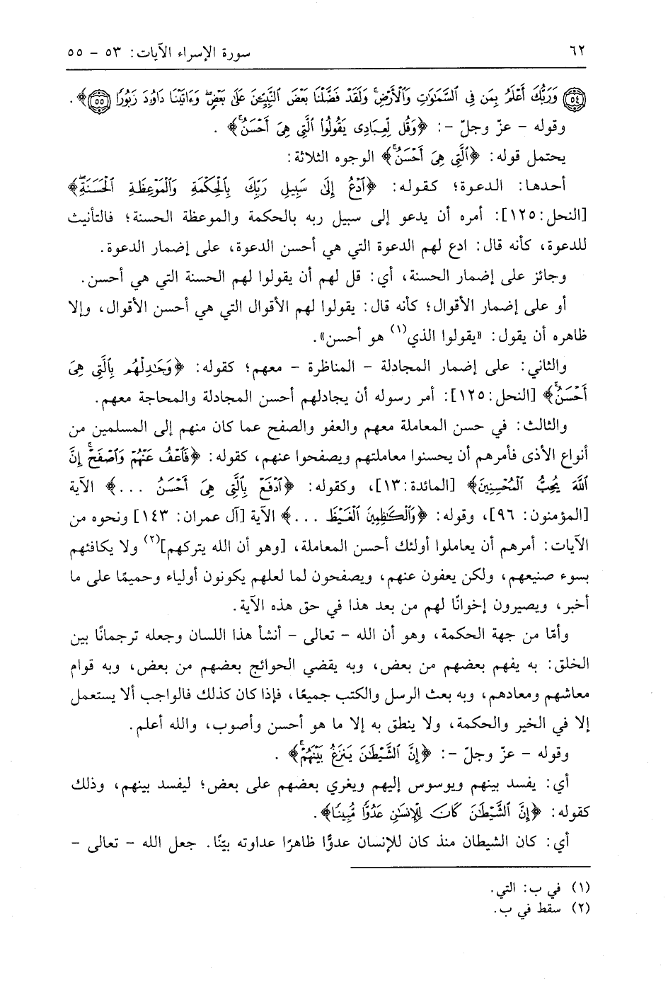 وقوله - عَزَّ وَجَلَّ -: (وَقُلْ لِعِبَادِي يَقُولُوا الَّتِي هِيَ أَحْسَنُ ... (53)