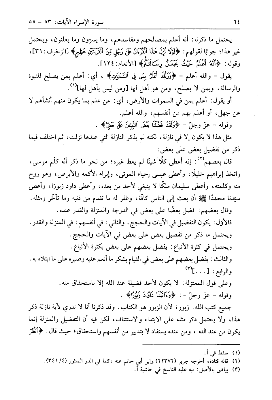 يقول - واللَّه أعلم - (وَرَبُّكَ أَعْلَمُ بِمَنْ فِي السَّمَاوَاتِ وَالْأَرْضِ)، أي: أعلم بمن يصلح للنبوة والرسالة، وبمن لا يصلح، ومن هو أهل لها أومن ليس بأهل لها.