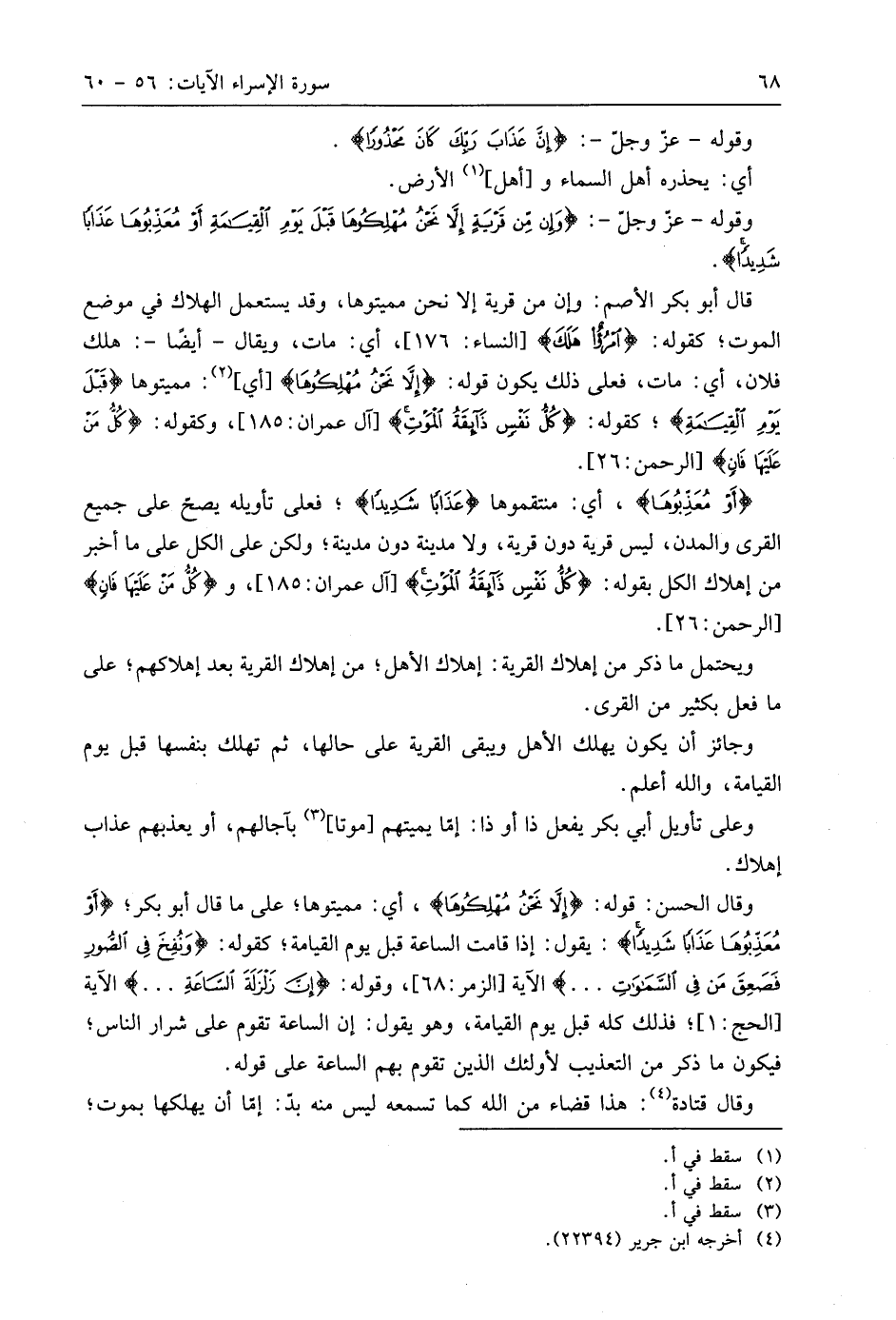 وقوله - عَزَّ وَجَلََّّ -: (وَإِنْ مِنْ قَرْيَةٍ إِلَّا نَحْنُ مُهْلِكُوهَا قَبْلَ يَوْمِ الْقِيَامَةِ أَوْ مُعَذِّبُوهَا عَذَابًا شَدِيدًا كَانَ ذَلِكَ فِي الْكِتَابِ مَسْطُورًا (58)